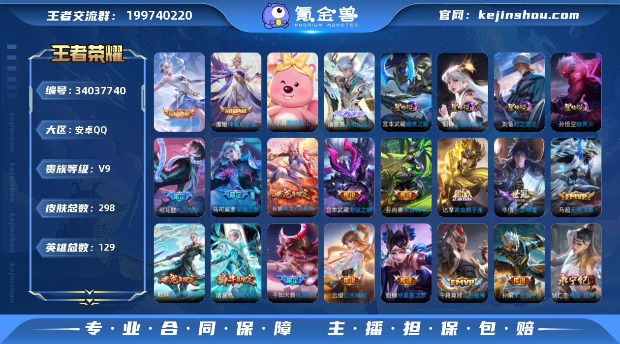 【精品V9·神鉴启示录·最初的交响·天机白泽·伽罗沧流箭·幽冥之眼·金色貂蝉·关羽神骥镇沧海·九山相柳·铠琥珀纪元·影龙天霄·妄想实况·神器狴犴令·绯月行·深海之息·寅虎赤拳·可二次】w23089-安卓Q-129英雄-298皮肤-15王者印记-200铭文-贵族积分10w【贵族9】【2典藏·1无双·1珍品·4星传说·36传说·14按键】【因赛季更新游戏段付以上号为准!】 【英雄全皮】:司马懿全皮,孙权全皮,敖隐全皮,莱西奥全皮,戈娅全皮 【荣耀典藏】:虞姬神鉴启示录,伽罗最初的交响 【无双皮肤】:诸葛亮天机白泽 【珍品传说】:伽罗沧流箭 【星元皮肤】:刘备时之思念,孙悟空幽冥火,宫本武藏幽冥之眼,貂蝉金色仲夏夜 【传说皮肤】:关羽神骥镇沧海,后羿神树通天,司马懿九山相柳,云缨幻光神枪,桑启鸣野蒿,孙策乘龙淬吴钩,赵云乘龙铭钟鼎,铠琥珀纪元,鲁班七号时之奇旅,兰陵王影龙天霄,马可波罗妄想实况,李白诗剑行,狄仁杰神器狴犴令,不知火舞绯月行,马可波罗深海之息,马超无双飞将,孙策挚爱之约,露娜启示之音,孙策末日机甲,裴擒虎寅虎赤拳,赵云淬星耀世,李元芳飞鸢探春,诸葛亮时雨天司,虞姬启明星使,李信一念神魔,刘备时之恋人,张良黄金白羊座,干将莫邪久胜战神,虞姬云霓...