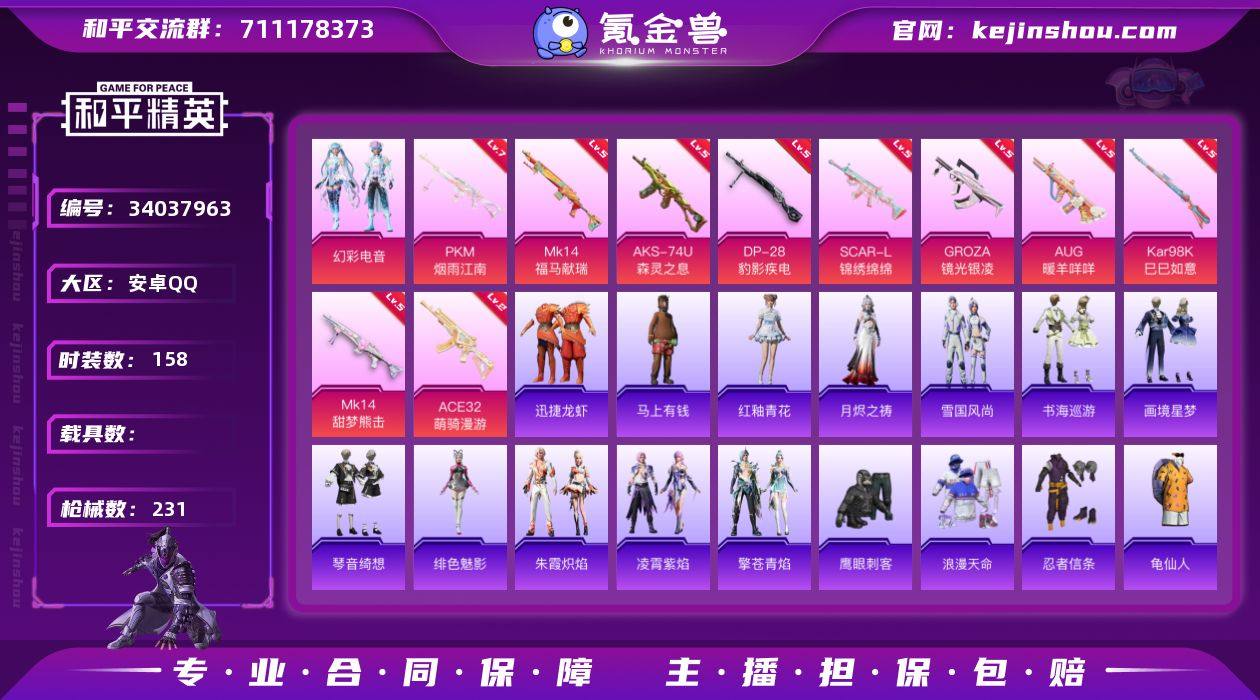 【kyhp1267】安卓 手Q-1粉装-10特效枪-0载具-1粉色飞行器-60113热力值-18王牌印记-158套装-231枪皮 【热门品类】:套装-浪漫天命,套装-忍者信条,套装-龟仙人 【粉色套装】:粉装-幻彩电音 【粉色枪皮等级】:SCAR-L-锦绣绵绵(五级),GROZA-镜光银凌(五级),AUG-暖羊咩咩(五级),ACE32-萌骑漫游(二级),AKS-74U-森灵之息(五级),Kar98K-巳巳如意(五级),Mk14-甜梦熊击(五级),Mk14-福马献瑞(五级),DP-28-豹影疾电(五级),PKM-江南烟雨(七级) 【粉色枪皮】:SCAR-L-锦绣绵绵,GROZA-镜光银凌,AUG-暖羊咩咩,ACE32-萌骑漫游,AKS-74U-森灵之息,Kar98K-巳巳如意,Mk14-甜梦熊击,Mk14-福马献瑞,DP-28-豹影疾电,PKM-江南烟雨 【粉色飞行器】:炫彩糖果飞行器 【粉色降落伞】:暗夜玫瑰降落伞,精灵梦叶罗丽降落伞,鬼刀降落伞,冷漠罗丽降落伞,绯穹魔姬降落伞,炫彩糖果降落伞 【稀有套装】:套装-龟仙人,套装-雪国风尚,套装-炫彩糖果,套装-马上有钱,套装-迅捷龙虾,套装-糖糖葫芦,套装-青团波波,角色-摩登魅猫,套装-燕燕于飞,套装-鱼渊荷华,角色-海琴烟,套装-紫幽梦,套装-蓝冰羽,套装-彩虹兔,套装-云朵鹅,套装-雪绒豹,角色-灵公主,套装-朱霞炽焰,套装-凌...
