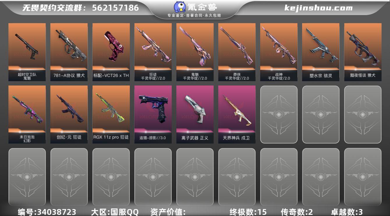 【NF550】【套装】:回火礼包// V25套装,千灵华绽//2.0套装,掠影//3.0套装【英雄】:幻棱,炼狱,暮蝶,捷风,幽影,不死鸟,贤者,猎枭,蝰蛇,芮娜,尚勃勒,盖可,黑梦【近战武器】:近战武器-蒙太奇 战斧,近战武器-碎心裂刃,近战武器-影蝶,近战武器-流风回雪【狂徒】:狂徒-创·纪元,狂徒-RGX 11z Pro,狂徒-千灵华绽//2.0【幻影】:幻影-末日泡泡,幻影-蒙太奇【戍卫】:戍卫-天界神兵【獠犬】:獠犬-黯夜怪谈,獠犬-781-A协议【莽侠】:莽侠-千灵华绽//2.0【战神】:战神-千灵华绽//2.0,战神-蒙太奇【骇灵】:骇灵-塑水宗,骇灵-蒙太奇【追猎】:追猎-掠影//3.0【VCT手枪】:标配-VCT26 x TH【正义】:正义-离子武器【鬼魅】:鬼魅-千灵华绽//2.0,鬼魅-超时空卫队【狂怒】:狂怒-蒙太奇【卡面】:代号红色 卡面,新兵报到 卡面,V契约 卡面,无畏契约 卡面【喷漆】:胜利属于无畏契约 喷漆,GLHF 喷漆,无畏契约 喷漆【挂饰】:针织蜜蜂 挂饰,无畏契约 纪念币 挂饰