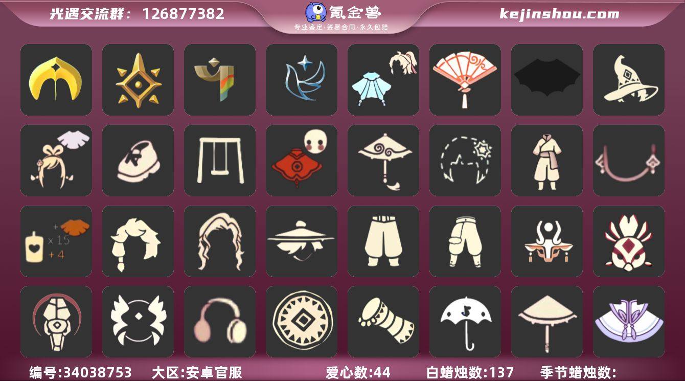 账号类型: 手机账号 季节已毕业: 圣岛季,预言季,彩染季,青鸟季 完成地图: 雨林,霞谷,暮土,禁阁 珍稀物品: 鳐鲲斗篷,阿努比斯(狗头) 礼包: 蝙蝠套,巫师,绊爱,运动鞋,秋千,福娃,红伞,雪花,暗彩装扮,新年耳钉,创始人,献瑞折扇礼包,青衫落拓礼包 裤子: 武士裤,搓澡巾 面具: 阿努比斯,凤凰面具,辉光羚羊面具 面饰: 红耳机,青鸟毕业面饰 发型: 若笠,虚荣,单侧绑发 斗篷: 黄色蓑衣,绿芽,彩染围巾斗篷,青鸟毕业斗篷 配饰: 雨伞,小红伞,圆鼓,蓝色手碟 亮点: 【优质装备】:预言季,阿努比斯(狗头),武士裤,圣岛季,鳐鲲斗篷,小红伞(姆明红伞)(姆明大伞),凤凰面具,单侧绑发(单边小辫),圆鼓(手拍大鼓),蓝色手碟(毕业手碟),辉光羚羊面具,彩染季,青鸟季,青鸟毕业面饰(青鸟面饰),青鸟毕业斗篷(青鸟斗篷),蝙蝠套(蝙蝠斗篷)(南瓜头),福娃(福娃礼包)(春之日礼包)(铜钱斗),绊爱(绊爱斗篷)(绊爱礼包),秋千(情人秋千),红耳机,红伞(瑞气纸伞),暗彩装扮(彩虹武士裤),巫师(巫师帽),雨林,霞谷,墓土(暮土),禁阁,若笠(箬笠),运动鞋(跃动跑鞋),创始人(创始人斗篷),献瑞折扇礼包,青衫落拓礼包,雪花(雪花发夹),新年耳钉(金鳞耳饰)