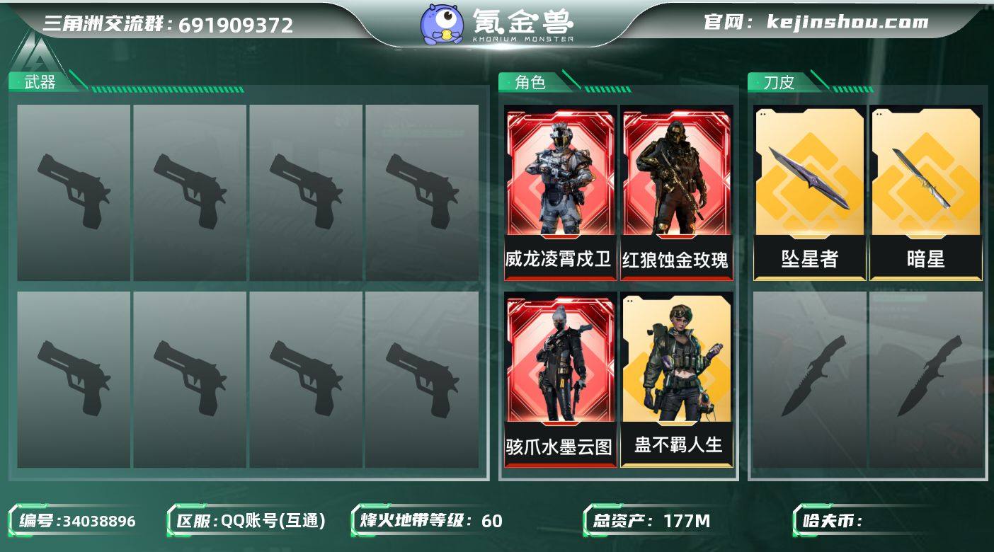 177m总资产【干员外观】:红狼蚀金玫瑰,威龙凌霄戍卫,蛊-不羁人生,骇爪水墨云图【近战皮肤】:坠星者,暗星