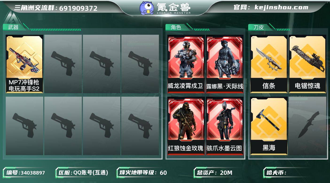 20m总资产【干员外观】:红狼蚀金玫瑰,电锯惊魂,威龙凌霄戍卫,威龙壮志凌云,无名夜鹰,蜂医送葬人无题密令,蛊-不羁人生,深蓝不破誓约,露娜黑·天际线,露娜金牌射手,骇爪水墨云图【近战皮肤】:信条,黑海,电锯惊魂【典藏1件】:MP7电玩S2