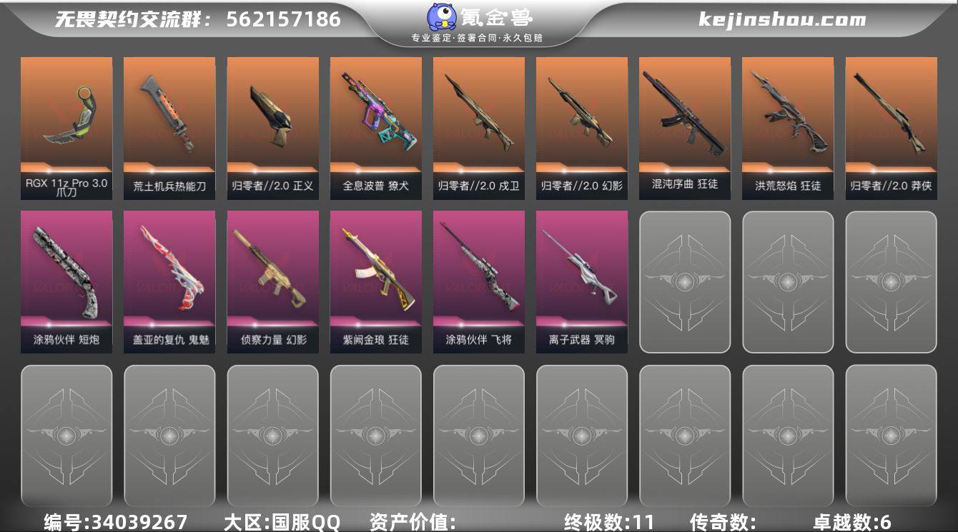 【套装】:归零者//2.0套装 【英雄】:幻棱,炼狱,维斯,暮蝶,壹决,铁臂,捷风,雷兹,幽影,不死鸟,贤者,猎枭,零,芮娜,奇乐,尚勃勒,霓虹,斯凯,夜露,星礈,K/O,盖可,黑梦,钢锁 【近战武器】:近战武器-RGX 11z Pro//3.0 爪刀,近战武器-荒土机兵 热能刀,近战武器-生物分子解离器,近战武器-影刃 【狂徒】:狂徒-洪荒怒焰,狂徒-混沌序曲,狂徒-紫阙金琅,狂徒-荒土机兵,狂徒-彩虹魔力小白马 【幻影】:幻影-归零者//2.0,幻影-侦察力量,幻影-纳米打击 【戍卫】:戍卫-归零者//2.0,戍卫-逆冲蛮牛 【獠犬】:獠犬-全息波普,獠犬-逆冲蛮牛 【冥驹】:冥驹-离子武器,冥驹-荒土机兵,冥驹-多边形 【飞将】:飞将-涂鸦伙伴 【莽侠】:莽侠-归零者//2.0 【奥丁】:奥丁-纳米打击 【判官】:判官-纳米打击x 【雄鹿】:雄鹿-逆冲蛮牛 【骇灵】:骇灵-荒土机兵,骇灵-无限竞技 【标配】:标配-荒土机兵 【正义】:正义-归零者//2.0,正义-纳米打击 【鬼魅】:鬼魅-盖亚的复仇,鬼魅-冬季仙境 【狂怒】:狂怒-蒙太奇,狂怒-逆冲蛮牛 【短炮】:短炮-涂鸦伙伴 【卡面】:终章:激斗汉堡 卡面,进入射程 卡面,分崩离析 卡面,纳米打击 卡面,抑制技术 卡面,激斗汉...