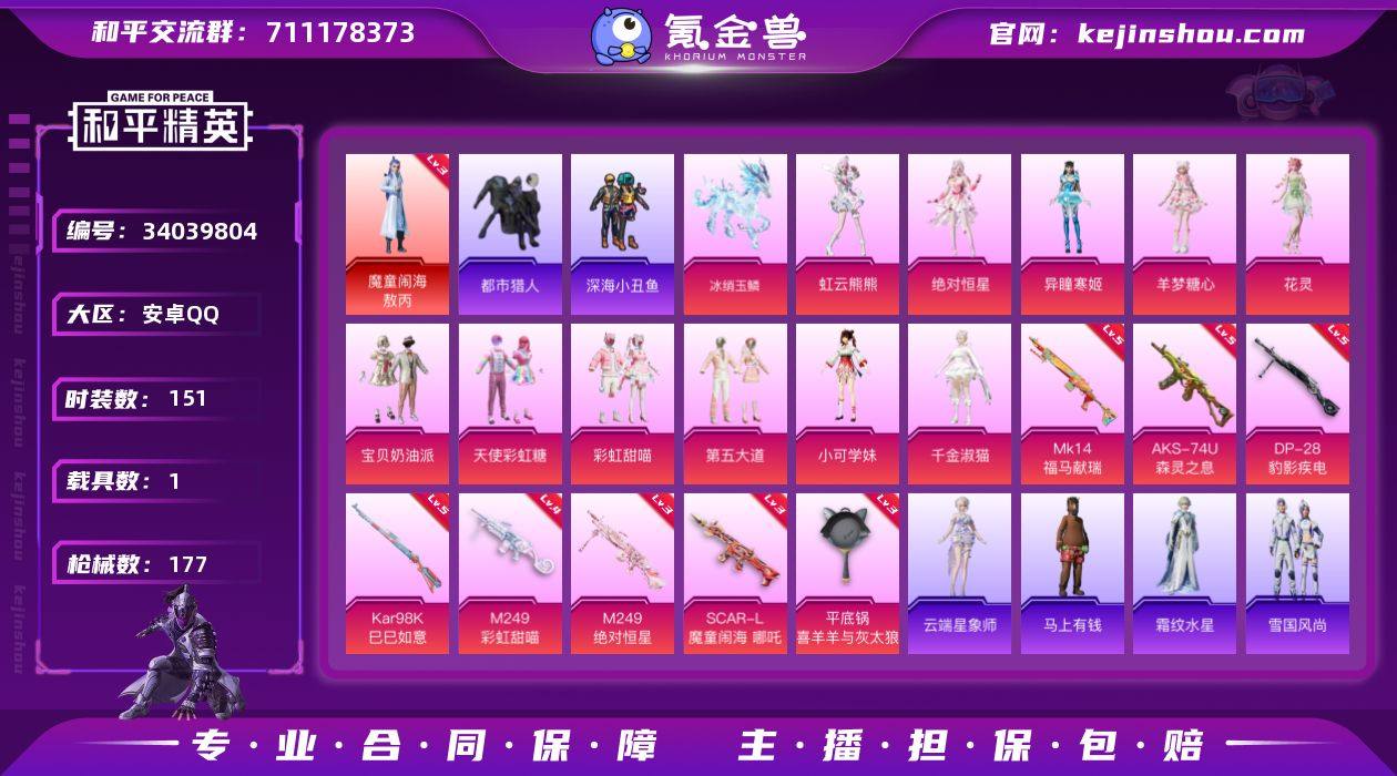 安卓 手Q-1神装-11粉装-8特效枪-1载具-6粉色飞行器-61095热力值-11王牌印记-151套装-177枪皮 【红色神装等级】:魔童闹海-敖丙(三级) 【红色角色神装】:魔童闹海-敖丙 【热门品类】:套装-都市猎人,套装-深海小丑鱼,套装-小丑鱼,套装-龟仙人 【粉色套装】:角色-绝对恒星,粉装-宝贝奶油派,粉装-天使彩虹糖,粉装-彩虹甜喵,粉装-第五大道,角色-小可学妹,角色-千金淑猫,角色-花灵,角色-羊梦糖心,角色-异瞳寒姬,角色-虹云熊熊 【粉色枪皮等级】:SCAR-L-魔童闹海 哪吒(三级),AKS-74U-森灵之息(五级),Kar98K-巳巳如意(五级),Mk14-福马献瑞(五级),M249-彩虹甜喵(四级),M249-绝对恒星(三级),DP-28-豹影疾电(五级),平底锅-喜羊羊与灰太狼(三级) 【粉色载具】:冰绡玉鳞 【粉色枪皮】:SCAR-L-魔童闹海 哪吒,AKS-74U-森灵之息,Kar98K-巳巳如意,Mk14-福马献瑞,M249-彩虹甜喵,M249-绝对恒星,DP-28-豹影疾电,平底锅-喜羊羊与灰太狼 【粉色飞行器】:绝对恒星飞行器,炫彩糖果飞行器,飞天猪飞行器,灵珠游龙飞行器,极意拳锋飞行器,暮色之舞飞行器 【粉色降落伞】:绝对恒星降落伞,甜心宝贝降落伞,暗夜玫瑰降落伞,洛神天依降落伞,彩虹甜喵降落伞,莲影清...
