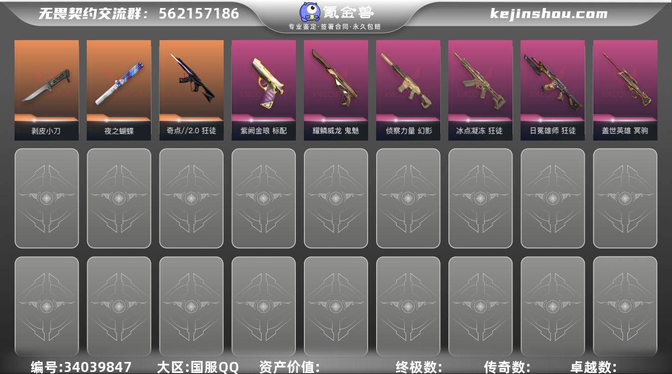 【英雄】:炼狱,维斯,暮蝶,钛狐,捷风,幽影,不死鸟,贤者,猎枭,零,芮娜,尚勃勒,霓虹,夜露,盖可,黑梦 【近战武器】:近战武器-影钩,近战武器-剥皮小刀,近战武器-夜之蝴蝶,近战武器-日耀风暴 遗器,近战武器-阿特拉斯指挥部 甩棍 【狂徒】:狂徒-奇点//2.0,狂徒-冰点凝冻,狂徒-日冕雄师 【幻影】:幻影-侦察力量 【冥驹】:冥驹-盖世英雄 【标配】:标配-紫阙金琅 【鬼魅】:鬼魅-耀鳞威龙,鬼魅-诡秘蛇影 【狂怒】:狂怒-蒙太奇 【卡面】:精灵大战 卡面,南瓜盛典 卡面,无畏契约:暮蝶 卡面,修车达人 卡面,正义的化身 卡面,梦幻奶茶 卡面,无畏契约GO!第一卷:芮娜 卡面,无畏契约GO!第一卷:零 卡面,代号红色 卡面,新兵报到 卡面,V契约 卡面,无畏契约 卡面 【喷漆】:战“素”兔 喷漆,控场勿近 喷漆,伤心心 喷漆,小丑猫 喷漆,熊抱 喷漆,超级粉丝 喷漆,捷风差距 喷漆,超能偶像 喷漆,买装还是存钱 喷漆,暴走萝莉 喷漆,红牌退场 喷漆,胜利属于无畏契约 喷漆,GLHF 喷漆,无畏契约 喷漆 【挂饰】:伞绳 挂饰,第九季//第三幕 纪念币 挂饰,无畏契约GO!第一卷 芮娜 挂饰,无畏契约GO!第一卷 零 挂饰,熔岩灯 挂饰,第九季//第二幕 纪念币...