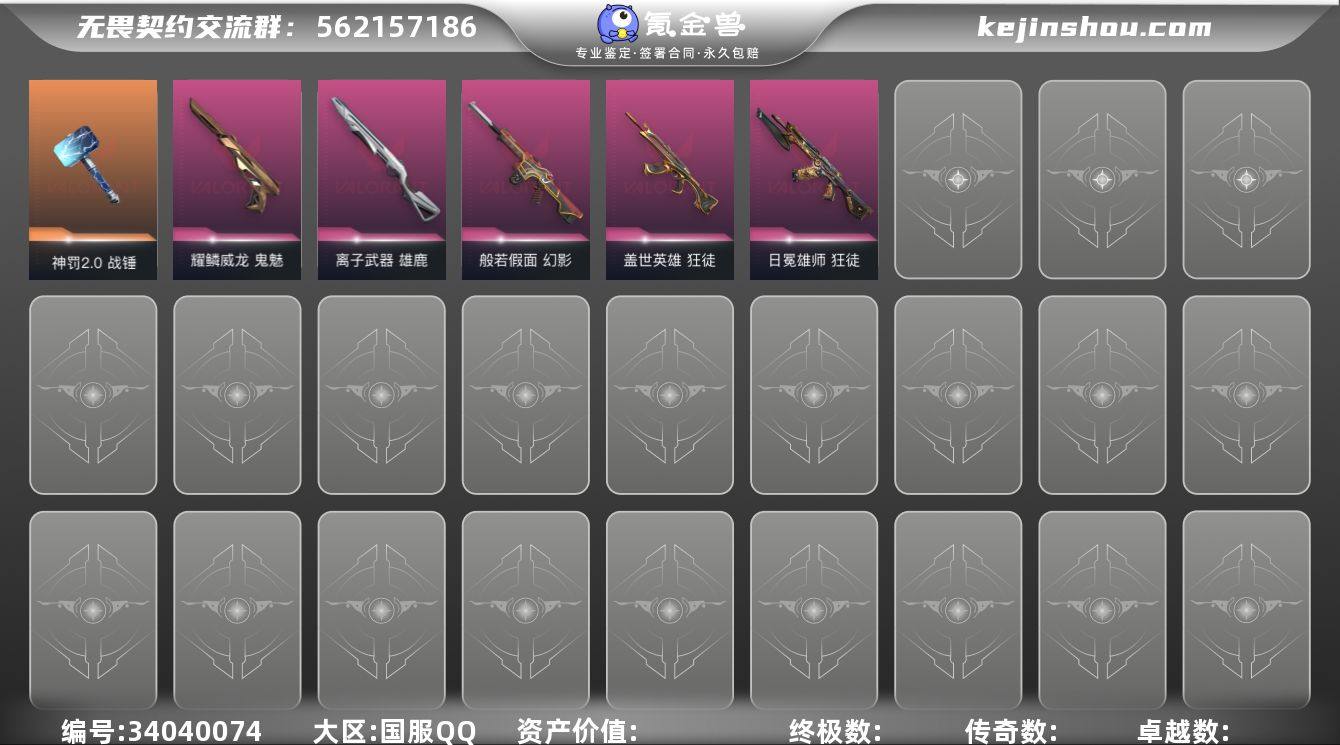 【英雄】:炼狱,暮蝶,壹决,捷风,不死鸟,贤者,猎枭,蝰蛇,尚勃勒,斯凯,海神,黑梦 【近战武器】:近战武器-神罚//2.0 战锤 【狂徒】:狂徒-盖世英雄,狂徒-日冕雄师 【幻影】:幻影-般若假面,幻影-手工达人 【奥丁】:奥丁-狂翼掠空 【判官】:判官-手工达人 【雄鹿】:雄鹿-离子武器 【鬼魅】:鬼魅-耀鳞威龙 【卡面】:无畏契约GO!第一卷:芮娜 卡面,无畏契约GO!第一卷:零 卡面,《双城之战》金克丝 卡面,代号红色 卡面,新兵报到 卡面,V契约 卡面,无畏契约 卡面 【喷漆】:霓光四射 喷漆,买装还是存钱 喷漆,关门放狗 喷漆,胜利属于无畏契约 喷漆,GLHF 喷漆,无畏契约 喷漆 【挂饰】:无畏契约GO!第一卷 零 挂饰,天外飞客 挂饰,无畏契约 纪念币 挂饰