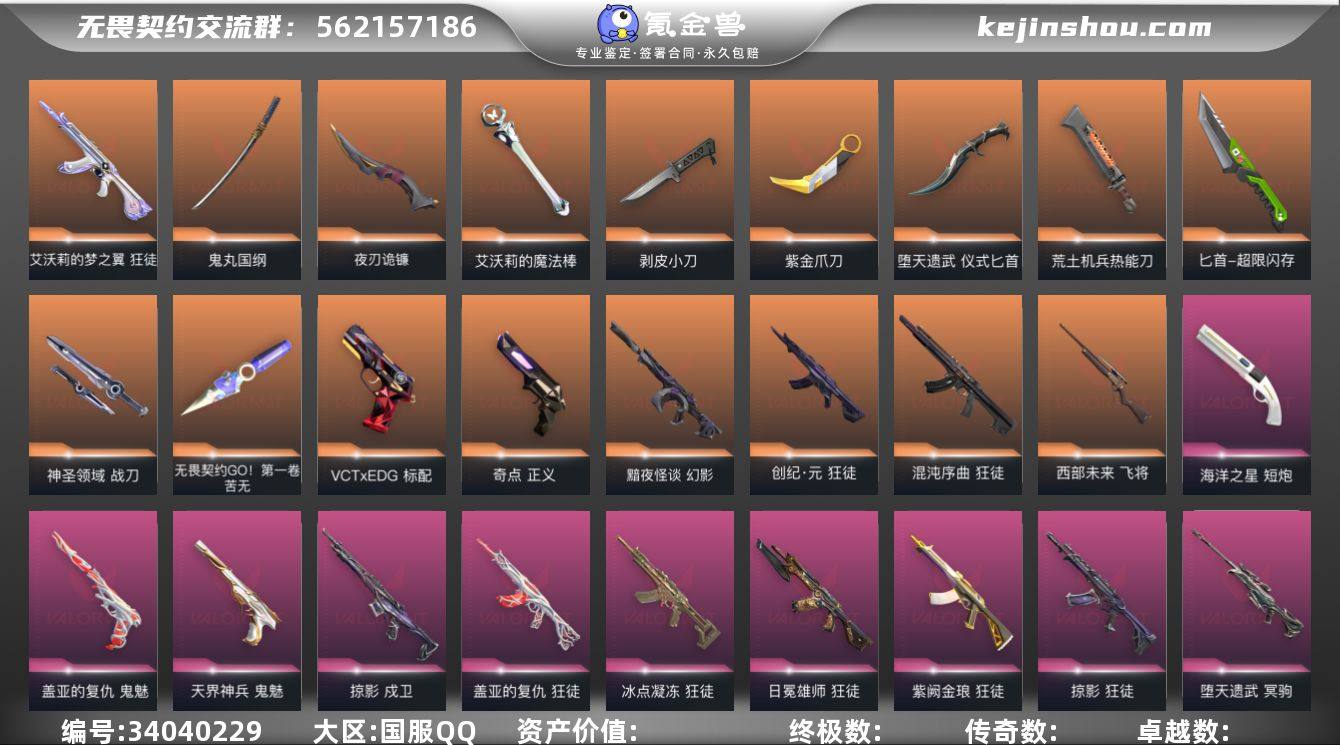 【套装】:2022全球冠军赛套装,VCT 2026 赛季套装,VCTxEDG 队伍套装 【英雄】:幻棱,炼狱,维斯,暮蝶,钛狐,壹决,铁臂,捷风,雷兹,幽影,不死鸟,贤者,猎枭,蝰蛇,零,芮娜,奇乐,尚勃勒,霓虹,斯凯,夜露,星礈,K/O,海神,盖可,黑梦,钢锁 【近战武器】:近战武器-2022全球冠军赛 蝴蝶刀,近战武器-VCT 2026 篆刀,近战武器-无畏契约GO!第一卷 苦无,近战武器-剥皮小刀,近战武器-紫金爪刀,近战武器-艾沃莉的魔法棒,近战武器-鬼丸国纲,近战武器-超限闪存 匕首,近战武器-堕天遗武 仪式匕首,近战武器-荒土机兵 热能刀,近战武器-夜刃诡镰,近战武器-神圣领域 战刀,近战武器-日耀风暴 遗器 【狂徒】:狂徒-混沌序曲,狂徒-创·纪元,狂徒-RGX 11z Pro,狂徒-艾沃莉的梦之翼,狂徒-冰点凝冻,狂徒-掠影,狂徒-盖亚的复仇,狂徒-日冕雄师,狂徒-紫阙金琅,狂徒-离子武器//2.0,狂徒-荒土机兵 【幻影】:幻影-2022全球冠军赛,幻影-黯夜怪谈,幻影-超限闪存,幻影-神圣领域,幻影-纳米打击 【戍卫】:戍卫-掠影,戍卫-浮光跃金,戍卫-逆冲蛮牛,戍卫-月球哨兵 【獠犬】:獠犬-神圣领域,獠犬-模拟赫兹,獠犬-逆冲蛮牛 【冥驹】:冥驹-堕天遗武,冥驹-离子武器...