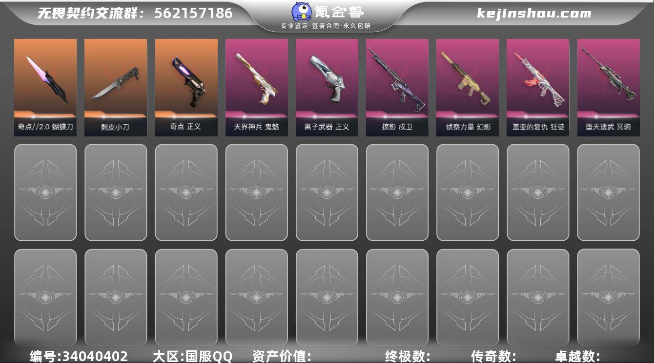 【英雄】:幻棱,炼狱,暮蝶,捷风,不死鸟,贤者,猎枭,零,芮娜 【近战武器】:近战武器-剥皮小刀,近战武器-奇点//2.0 蝴蝶刀,近战武器-诡秘蛇影 军刀,近战武器-日耀风暴 遗器,近战武器-阿特拉斯指挥部 甩棍,近战武器-星际猎兵 短剑 【狂徒】:狂徒-多弥尔的复仇,狂徒-盖亚的复仇,狂徒-离子武器//2.0,狂徒-诡秘蛇影 【幻影】:幻影-侦察力量,幻影-末日之翼 【戍卫】:戍卫-掠影,戍卫-折光棱晶 【冥驹】:冥驹-堕天遗武 【飞将】:飞将-末日之翼 【莽侠】:莽侠-诡秘蛇影 【奥丁】:奥丁-末日之翼 【判官】:判官-诡秘蛇影 【骇灵】:骇灵-无限竞技 【蜂刺】:蜂刺-折光棱晶 【标配】:标配-折光棱晶 【正义】:正义-奇点,正义-离子武器 【鬼魅】:鬼魅-天界神兵,鬼魅-诡秘蛇影 【狂怒】:狂怒-蒙太奇 【短炮】:短炮-末日之翼 【卡面】:银弹猎手 卡面,无畏契约:暮蝶 卡面,热舞环节 卡面,超限闪存 卡面,铁之华 卡面,Clutch 卡面,哨卫者之领域 卡面,无畏契约GO!第一卷:芮娜 卡面,无畏契约GO!第一卷:零 卡面,《双城之战》金克丝 卡面,无畏契约GO!第一卷:贤者 卡面,黑影先生的咖啡! 卡面,天台狂欢 卡面,代号红色 卡面,新兵报到 卡面,V契约...