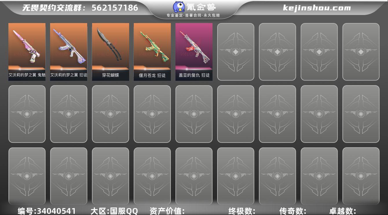 高品质极品库存位定级可排位小号 【英雄】:炼狱,暮蝶,壹决,捷风,不死鸟,贤者,猎枭,芮娜,尚勃勒,K/O 【近战武器】:近战武器-穿花蝴蝶 【狂徒】:狂徒-偃月苍龙,狂徒-艾沃莉的梦之翼,狂徒-盖亚的复仇 【骇灵】:骇灵-神中神罚 【鬼魅】:鬼魅-艾沃莉的梦之翼 【狂怒】:狂怒-蒙太奇 【卡面】:源能反应 卡面,无畏契约GO!第一卷:零 卡面,代号红色 卡面,新兵报到 卡面,V契约 卡面,无畏契约 卡面 【喷漆】:他们将落荒而逃 喷漆,胜利属于无畏契约 喷漆,GLHF 喷漆,无畏契约 喷漆 【挂饰】:无畏契约GO!第一卷 芮娜 挂饰,无畏契约GO!第一卷 零 挂饰,鱼骨头 挂饰,无畏契约 纪念币 挂饰