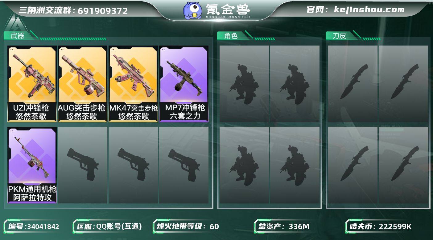 【LX26764 追封包赔+包人脸】【总资产:336.6m,流动资产:308.6m】 特勤满体满负-60烽火等级-黑鹰-5战场等级-无军衔 【近战皮肤】:近战-黑鹰 【传说外观】:AUG突击步枪-悠然茶歇,MK47突击步枪-悠然茶歇,UZI冲锋枪-悠然茶歇 【史诗外观】:MP7冲锋枪-六套之力,PKM通用机枪-阿萨拉特攻,QJB201轻机枪-炽焰 【稀有外观】:SG552突击步枪-贴花艺术, AK-12突击步枪-马年新春,SCAR-H战斗步枪-猛攻,MP5冲锋枪-弄臣,SMG-45冲锋枪-行动开启,QJB201轻机枪-哈夫克卫队,QJB201轻机枪-猛攻,Mini-14射手步枪-荣耀列队 【普通外观】:M4A1突击步枪-粉色涂装,QBZ95-1突击步枪-高雅黑,K416突击步枪-高雅黑,M16A4突击步枪-出货,M7战斗步枪-黑巧甜心,SG552突击步枪-浅蓝涂装,SG552突击步枪-狂欢,AS Val突击步枪-黑巧甜心,MP5冲锋枪-海色,Vector冲锋枪-几何迷彩,UZI冲锋枪-海色,M1014霰弹枪-重击,杠杆式步枪-出货,PKM通用机枪-出货,QJB201轻机枪-典雅,QJB201轻机枪-玲珑,SR-25射手步枪-黑巧甜心,SR9射手步枪-出货 【挂饰】:挂饰-祥龙,挂饰-福禄*2,挂饰-聚宝盆,挂饰-隐者,挂饰-审判,挂饰-悠然茶歇,挂饰-麻将*6,挂饰-星象仪*8
