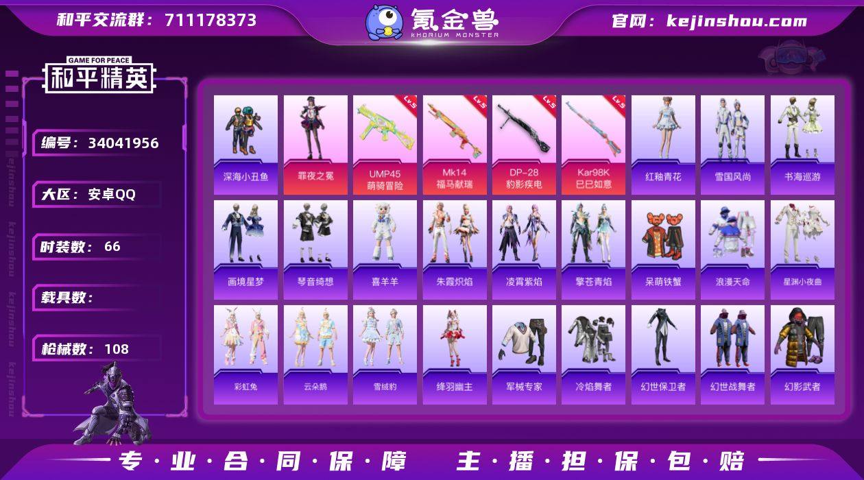 安卓 手Q-1粉装-4特效枪-0载具-1粉色飞行器-25235热力值-5王牌印记-66套装-108枪皮 【热门品类】:套装-浪漫天命,套装-深海小丑鱼 【粉色套装】:角色-罪夜之冕 【粉色枪皮等级】:UMP45-萌骑冒险(五级),Kar98K-巳巳如意(五级),Mk14-福马献瑞(五级),DP-28-豹影疾电(五级) 【粉色枪皮】:UMP45-萌骑冒险,Kar98K-巳巳如意,Mk14-福马献瑞,DP-28-豹影疾电 【粉色飞行器】:炫彩糖果飞行器 【粉色降落伞】:星之彼岸降落伞,千金淑猫降落伞,鬼刀降落伞,炫彩糖果降落伞 【稀有套装】:套装-雪国风尚,套装-炫彩糖果,套装-星渊小夜曲,套装-彩虹兔,套装-云朵鹅,套装-雪绒豹,角色-绛羽幽主,套装-朱霞炽焰,套装-凌霄紫焰,套装-擎苍青焰,玩偶服-喜羊羊,套装-书海巡游,套装-画境星梦,套装-琴音绮想,套装-雨过天青,套装-红釉青花 【稀有枪皮】:AUG-冰晶雪宝,AKM-影袭,AKM-破晓战魂,AKM-龙的传人,M16A4-千金淑猫,SCAR-L-暗夜玫瑰,SCAR-L-生命誓言,M416-红色方程式,M416-蓝色火焰,QBZ-彩虹符号,M762-彩虹符号,M762-云朵鹅,M762-登顶巅峰,蜜獾-天降萌叽,ACE32-画境星梦,ARX-凌霄紫焰,UZI-啾咪啾咪,Vector-生命誓言,汤姆逊-耀粉歌者,MP5K-画境星梦...