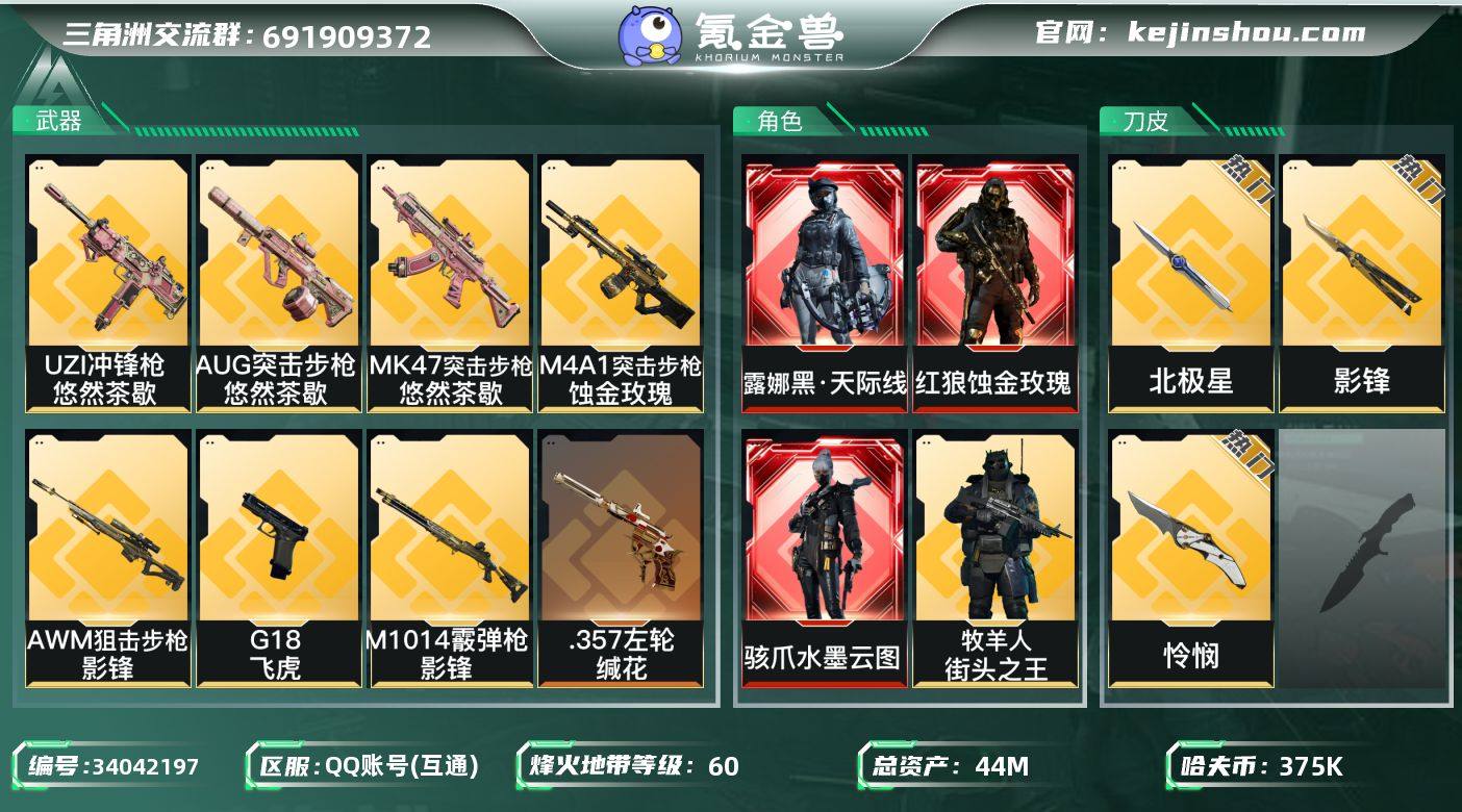 44m总资产-375k哈夫币-60烽火等级-铂金-50战场等级-上等兵 【干员外观】:红狼-蚀金玫瑰,骇爪-水墨云图,露娜-黑·天际线,威龙-壮志凌云,威龙-飞虎,蜂医-送葬人·无题密令,牧羊人-街头之王,无名-夜鹰,深蓝-不破誓约,红狼-电锯惊魂 【近战皮肤】:近战-北极星,近战-影锋,近战-怜悯,近战-黑鹰 【传说外观】:M4A1突击步枪-蚀金玫瑰,M4A1突击步枪-阿米娅,AUG突击步枪-悠然茶歇,M7战斗步枪-维京,AK-12突击步枪-夜鹰,AK-12突击步枪-特斯拉线圈,SCAR-H战斗步枪-铁艺苍穹,SCAR-H战斗步枪-水墨云图,SCAR-H战斗步枪-启航,CAR-15突击步枪-阿米娅,AS Val突击步枪-蛇年祥瑞,腾龙突击步枪-捞点薯条,KC17突击步枪-电锯惊魂,MK47突击步枪-悠然茶歇,UZI冲锋枪-特斯拉线圈,UZI冲锋枪-悠然茶歇,SMG-45冲锋枪-骑士,SR-3M紧凑突击步枪-特斯拉线圈,勇士冲锋枪-能天使-午夜邮差,M1014霰弹枪-影锋,725双管霰弹枪-送葬人-无题密令,M250通用机枪-骑士之心,M14射手步枪-缄花,SR-25射手步枪-水墨云图,SR-25射手步枪-缄花,AWM狙击步枪-影锋,AWM狙击步枪-捞点薯条,.357左轮-缄花,G18-飞虎,93R-捞点薯条,复合弓-黑·天际线 【史诗外观】:Ash-12战斗步枪-飓风行动,M8...