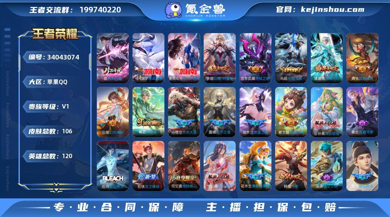 【5439】苹果Q-V0-永恒钻石I段位-119英雄-106皮肤-3珍品传说-11传说-36史诗 【珍品传说】:暃朽木白哉,鲁班七号江户川柯南,马可波罗怪盗基德 【传说皮肤】:云缨幻光神枪,桑启鸣野蒿,典韦战鼓燎原,花木兰燃星之曲,孙悟空齐天大圣,李信山海炽霜斩,马超无双飞将,露娜启示之音,蔡文姬花朝如约,诸葛亮时雨天司,宫本武藏地狱之眼 【限定皮肤】:蒙犽顽岩魄,蔡文姬夏日便利店,虞姬夏日便利店,姜子牙天穹之誓,李白谪仙醉月,狄仁杰阴阳师,赵云皇家上将,妲己热情桑巴,孙尚香蔷薇恋人,阿轲迷踪丽影,狄仁杰魔术师,达摩沙漠行僧,项羽海滩派对,露娜启示之音,韩信飞衡,兰陵王驯魔猎人,花木兰青春决赛季,花木兰燃星之曲,孙悟空齐天大圣,李元芳银河之约,诸葛亮时雨天司,李信山海炽霜斩,猪八戒西部大镖客,司空震地狱燃心,张良古海寻踪,鬼谷子天穹祈灯,沈梦溪龙舞盛年,周瑜熔金海岸 【年限皮肤】:韩信飞衡,诸葛亮时雨天司,李信山海炽霜斩 【赛季限定】:达摩沙漠行僧,张良古海寻踪,鬼谷子天穹祈灯,姜子牙天穹之誓,东皇太一噬灭天穹,太乙真人谧流熔炉,钟馗虚灵犬护,甄姬逆浪荇歌 【战令限定】:兰陵王驯魔猎人,李元芳银河之约,阿轲迷踪丽影,...