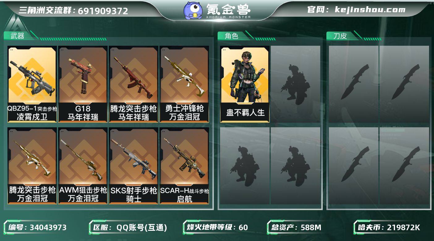 编号A02399 可二次 等级60 总资产588.6m 流动资产531m 哈夫币170m 基础安全箱 仓库lv10 训练中心lv7 靶场lv7