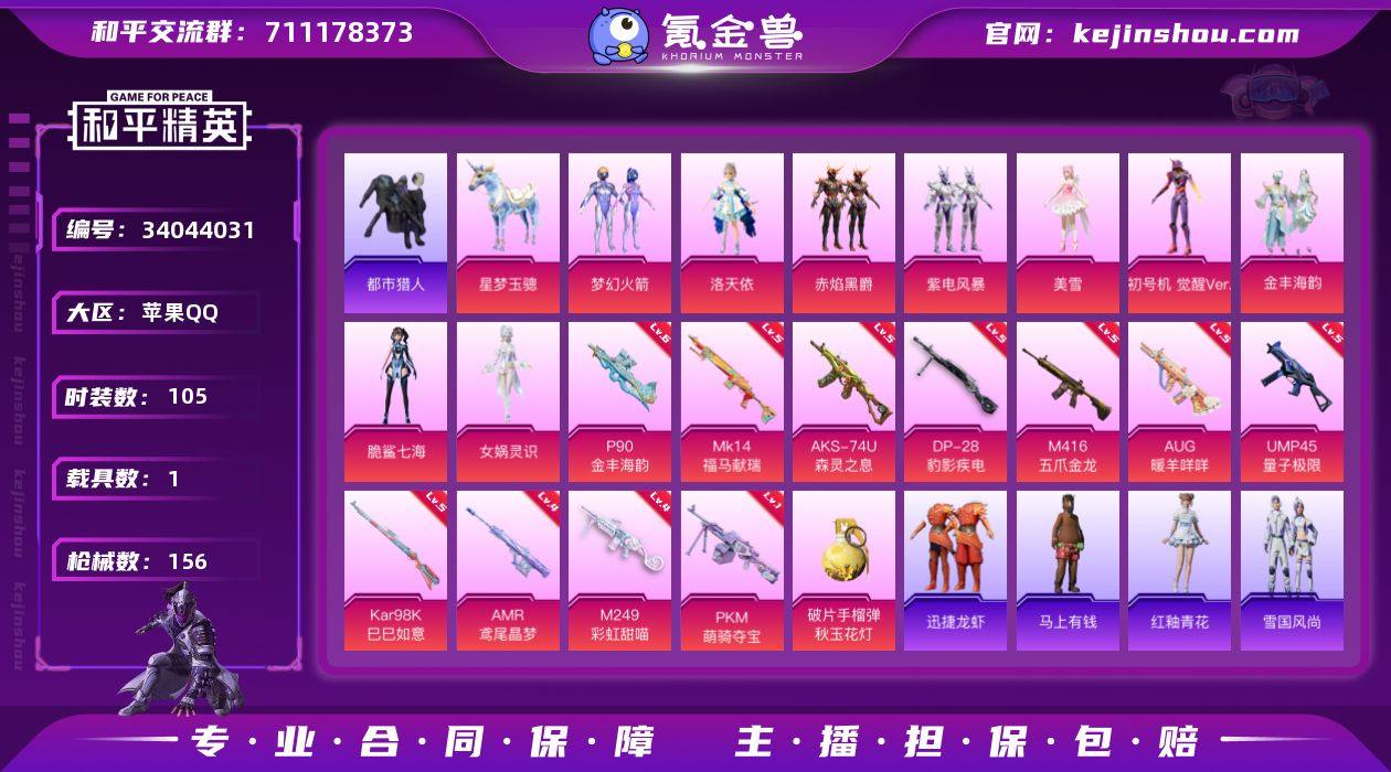 苹果 手Q-9粉装-12特效枪-1载具-2粉色飞行器-50597热力值-7王牌印记-105套装-156枪皮 【热门品类】:粉装-梦幻火箭,套装-都市猎人,套装-金羽特工,角色-8号机,角色-Mark.06 【粉色套装】:粉装-梦幻火箭,角色-洛天依,粉装-赤焰黑爵,粉装-紫电风暴,角色-美雪,角色-初号机 觉醒Ver.,粉装-金丰海韵,角色-脆鲨七海,角色-女娲灵识 【粉色枪皮等级】:M416-五爪金龙(五级),AUG-暖羊咩咩(五级),UMP45-量子极限(五级),AKS-74U-森灵之息(五级),P90-金丰海韵(六级),Kar98K-巳巳如意(五级),Mk14-福马献瑞(五级),AMR-鸢尾晶梦(四级),M249-彩虹甜喵(四级),DP-28-豹影疾电(五级),PKM-萌骑夺宝(一级) 【粉色载具】:星梦玉骢 【粉色枪皮】:M416-五爪金龙,AUG-暖羊咩咩,UMP45-量子极限,AKS-74U-森灵之息,P90-金丰海韵,Kar98K-巳巳如意,Mk14-福马献瑞,AMR-鸢尾晶梦,M249-彩虹甜喵,DP-28-豹影疾电,PKM-萌骑夺宝,破片手榴弹-秋玉花灯 【粉色飞行器】:齐天大圣飞行器,脆鲨七海飞行器 【粉色降落伞】:甜心宝贝降落伞,洛神天依降落伞,碧影闪光降落伞,垂柳戏鸭降落伞,精灵梦叶罗丽降落伞,鸢尾晶梦降落伞,金丰海韵降落伞,脆鲨七海降落伞,晶梦幻蝶降落伞...
