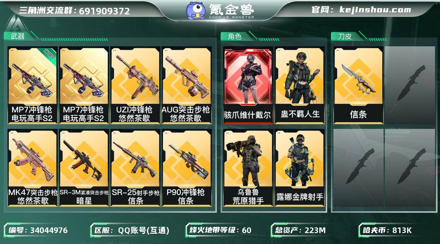 【PTSJZ4982】总资产223M/哈夫币81万/传说近战数1/传说枪皮数30/战场等级45/行动等级60/安全箱等时效性道具以游戏内数据为准,详情请看图/骇爪-维什戴尔/红狼-电锯惊魂/露娜-金牌射手(S7)/乌鲁鲁-荒原猎手/蛊-不羁人生/近战-信条/近战-处刑者2级/近战-黑鹰/MP7冲锋枪-电玩高手S2/优品C典藏武器外观-MP7冲锋枪-电玩高手S2/M4A1突击步枪-阿米娅/AKM突击步枪-锦绣/ASh-12战斗步枪-鹅鸭杀/AUG突击步枪-悠然茶歇/AUG突击步枪-西装暴徒/SG552突击步枪-运动员/SCAR-H战斗步枪-启航/G3战斗步枪-骑士/CAR-15突击步枪-阿米娅/腾龙突击步枪-马年祥瑞/K437突击步枪-锦绣/KC17突击步枪-电锯惊魂/MK47突击步枪-悠然茶歇/P90冲锋枪-信条/UZI冲锋枪-悠然茶歇/SMG-45冲锋枪-锦绣/SR-3M紧凑突击步枪-暗星/QCQ171冲锋枪-鹅鸭杀/QCQ171冲锋枪-不羁人生/QJB201轻机枪-鹅鸭杀/M14射手步枪-电锯惊魂/M14射手步枪-蛮荒/M14射手步枪-缄花/SKS射手步枪-骑士/SR-25射手步枪-信条/SR-25射手步枪-缄花/R93狙击步枪-维什戴尔/.357左轮-缄花/G18-马年祥瑞/K416突击步枪-冬日风情/K416突击步枪-腊梅/K416突击步枪-阿萨拉特攻/K416突击步枪-缄默情歌/M7战斗步枪-百步穿杨/SG552突击步枪-深海恐惧/SG552突击步枪-...
