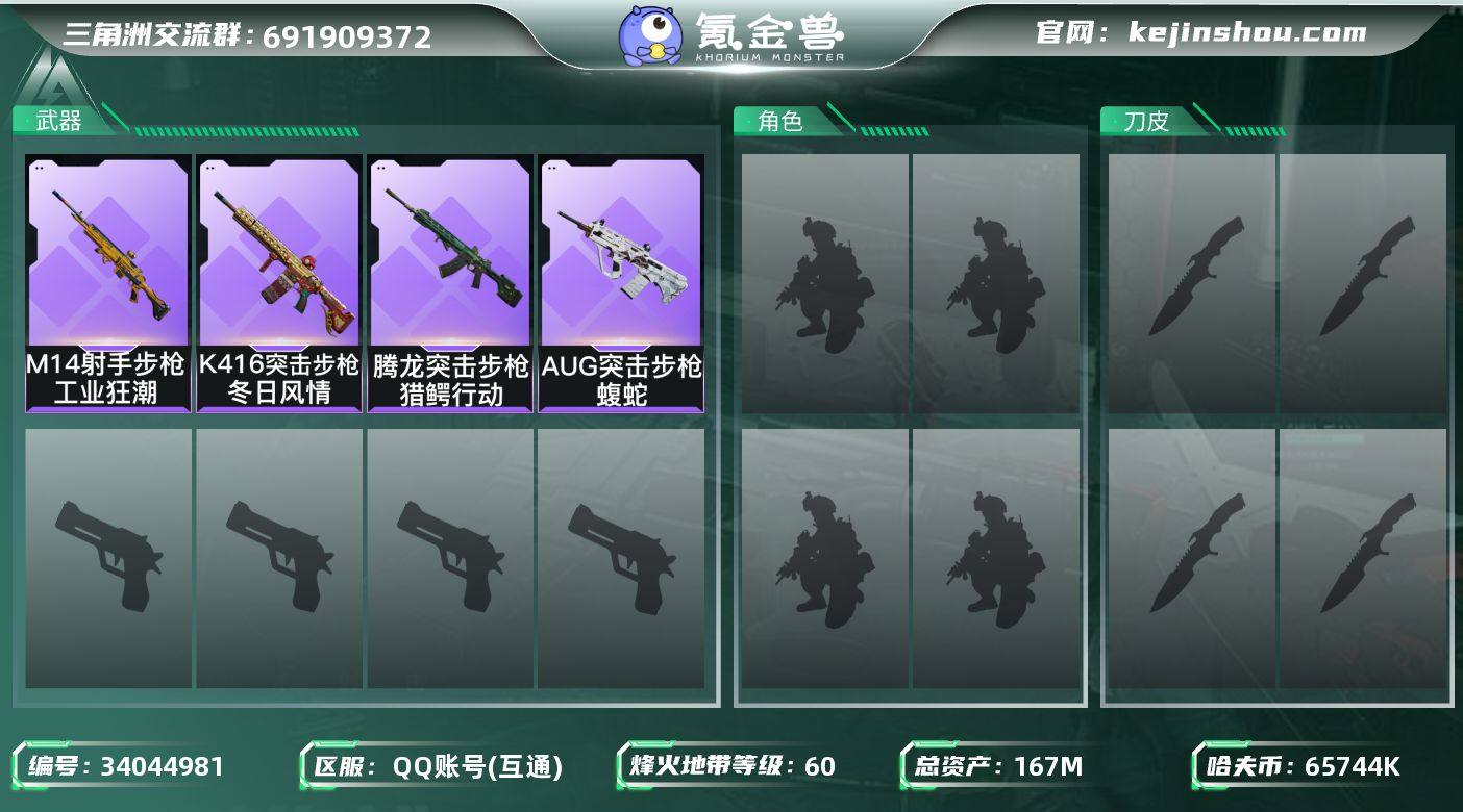 【AYS313】167m总资产-65744k哈伏币-60烽火等级-白银-1战场等级-无军衔 【近战皮肤】:近战-黑鹰 【史诗外观】:K416突击步枪-冬日风情,AUG突击步枪-蝮蛇,腾龙突击步枪-猎鳄行动,M14射手步枪-工业狂潮 【稀有外观】:SG552突击步枪-2026,Vector冲锋枪-先锋,SMG-45-行动开启,SMG-45冲锋枪-幻影结构,勇士冲锋枪-冰天雪地,SV-98狙击步枪-星链科技,SV-98狙击步枪-哈夫克航天,SV-98狙击步枪-精英联盟 【普通外观】:M870霰弹枪-马赛克涂装,M4A1突击步枪-粉色涂装,M4A1突击步枪-高雅黑,M4A1突击步枪-海色,QBZ95-1突击步枪-海浪,QBZ95-1突击步枪-2026,K416突击步枪-高雅黑,AUG突击步枪-浅蓝涂装,SG552突击步枪-浅蓝涂装,SG552突击步枪-海浪,SCAR-H战斗步枪-数码迷彩,G3战斗步枪-高雅黑,PTR-32突击步枪-黄蜂,MP5冲锋枪-海色,MP5冲锋枪-黄蜂,Vector冲锋枪-几何迷彩,UZI冲锋枪-海色,野牛冲锋枪-高雅黑,M1014霰弹枪-高雅黑,M1014霰弹枪-海浪,SVD狙击步枪-高雅黑,PSG-1射手步枪-雪松,沙漠之鹰-海浪,G17-2026 【载具外观】:M1A4坦克-驯鹿 【挂饰】:挂饰-崩岩重炮*2,挂饰-暗行哨兵*6,挂饰-牛角,挂饰-起舞的女郎,挂饰-紧急撤离*28