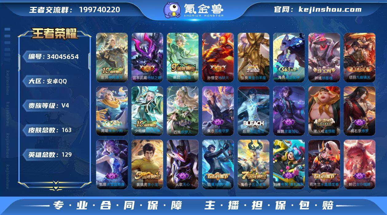 实名: 可修改 性别: 男号 贵族等级: V4 英雄数: 129 皮肤数: 163 传说皮: 黄金白羊座,地狱火,地狱之眼,神树通天 限定皮: 李小龙,高山流水,猪悟能,五谷丰年,鸣野蒿 亮点: 【优质装备】:黄金白羊座,地狱火,地狱之眼