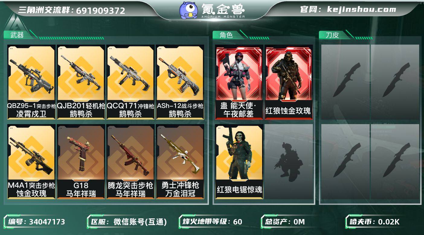 实名: 可修改 烽火地带段位: 铂金 全面战场段位: 列兵 总资产: 149 哈夫币: 26 干员外观: 红狼-蚀金玫瑰,蛊-能天使·午夜邮差,红狼-电锯惊魂 传说武器皮肤: M4A1突击步枪-蚀金玫瑰,M4A1突击步枪-阿米娅,AK-12突击步枪-特斯拉线圈,SR-3M紧凑突击步枪-特斯拉线圈,UZI冲锋枪-特斯拉线圈,勇士冲锋枪-能天使-午夜邮差,Vector冲锋枪-能天使-午夜邮差,M250通用机枪-骑士之心,R93狙击步枪-维什戴尔,SCAR-H战斗步枪-启航,ASh-12战斗步枪-鹅鸭杀,QCQ171冲锋枪-鹅鸭杀,QJB201轻机枪-鹅鸭杀,KC17突击步枪-电锯惊魂,SG552突击步枪-运动员,SKS射手步枪-骑士,QBZ95-1突击步枪-凌霄戍卫,腾龙突击步枪-马年祥瑞,G18-马年祥瑞,勇士冲锋枪-万金泪冠,腾龙突击步枪-万金泪冠,AWM狙击步枪-万金泪冠,.357左轮-缄花,SR-25射手步枪-缄花,M14射手步枪-缄花,SMG-45冲锋枪-锦绣,K437突击步枪-锦绣,AKM突击步枪-锦绣