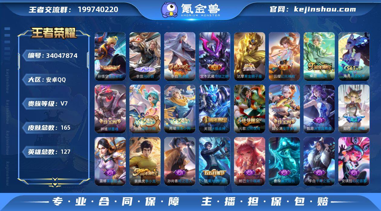 CHC70061 安卓Q-V7-至尊星耀V段位-127英雄-165皮肤-1典藏皮肤-1无双-5传说-36史诗 【英雄全皮】:孙权全皮,敖隐全皮 【荣耀典藏】:孙悟空全息碎影 【无双皮肤】:李信问心剑 【传说皮肤】:云缨幻光神枪,桑启鸣野蒿,达摩黄金狮子座,李白凤求凰,宫本武藏地狱之眼 【限定皮肤】:姜子牙天穹之誓,杨戬破阵退雄兵,狄仁杰阴阳师,赵云皇家上将,墨子神迹守卫,妲己时之彼端,元歌云间偶戏,狄仁杰魔术师,狄仁杰万华元夜,项羽海滩派对,老夫子醍醐杖,关羽冰锋战神,程咬金演武夺筹,亚瑟潮玩骑士王,钟馗驱傩正仪,蔡文姬繁星吟游,鬼谷子原初探秘者,弈星混沌棋,明世隐疑决卦,裴擒虎李小龙,云中君纤云弄巧,鲁班大师探海日志,阿古朵江河有灵,张良古海寻踪,蒙恬荣光圣徽,鬼谷子天穹祈灯,姬小满妄想食味,沈梦溪龙舞盛年,刘邦剑破天穹,程咬金群星魔术团,周瑜熔金海岸 【年限皮肤】:李白凤求凰 【赛季限定】:弈星混沌棋,明世隐疑决卦,老夫子醍醐杖,鬼谷子原初探秘者,狄仁杰万华元夜,程咬金演武夺筹,钟馗驱傩正仪,鲁班大师探海日志,张良古海寻踪,鬼谷子天穹祈灯,刘邦剑破天穹,姜子牙天穹之誓,东皇太一噬灭天穹,太乙真人谧流熔炉,甄姬逆浪荇歌,...