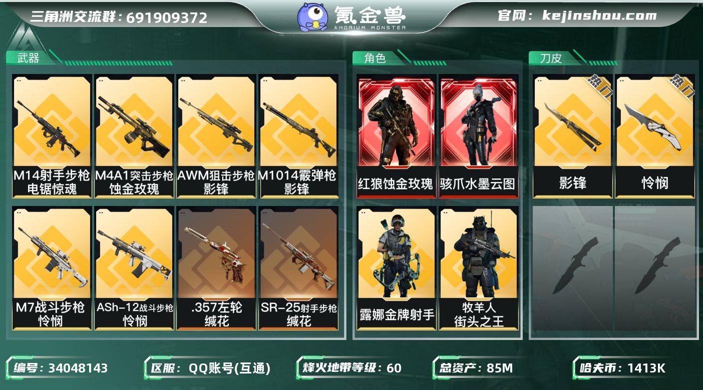 【SJ10410】总资产85M/哈夫币141万/传说近战数1/传说枪皮数22/战场等级50/行动等级60/安全箱等时效性道具以游戏内数据为准,详情请看图/红狼-蚀金玫瑰/骇爪-水墨云图/威龙-铁面判官(S1)/威龙-壮志凌云(S3)/牧羊人-街头之王(S2)/红狼-电锯惊魂/露娜-金牌射手(S7)/近战-影锋/近战-怜悯/近战-黑鹰/M4A1突击步枪-蚀金玫瑰/QBZ95-1突击步枪-破军/ASh-12战斗步枪-怜悯/M7战斗步枪-神秘艺术/M7战斗步枪-怜悯/M7战斗步枪-维京/SG552突击步枪-运动员/SCAR-H战斗步枪-铁艺苍穹/SCAR-H战斗步枪-水墨云图/SCAR-H战斗步枪-启航/KC17突击步枪-电锯惊魂/P90冲锋枪-神秘艺术/勇士冲锋枪-能天使-午夜邮差/M1014霰弹枪-影锋/M14射手步枪-电锯惊魂/M14射手步枪-缄花/SKS射手步枪-骑士/SR-25射手步枪-水墨云图/SR-25射手步枪-缄花/R93狙击步枪-维什戴尔/AWM狙击步枪-影锋/.357左轮-缄花/M4A1突击步枪-特勤执行/QBZ95-1突击步枪-曙光/QBZ95-1突击步枪-ACE/K416突击步枪-竞技风/K416突击步枪-冬日风情/M16A4突击步枪-竞赛选手/AUG突击步枪-战术迷彩/AUG突击步枪-蝮蛇/AUG突击步枪-特勤执行/M7战斗步枪-百步穿杨/SCAR-H战斗步枪-国风/SCAR-H战斗步枪-危险实验/G3战斗步枪-阿萨拉工艺/G3战斗步枪-战场...