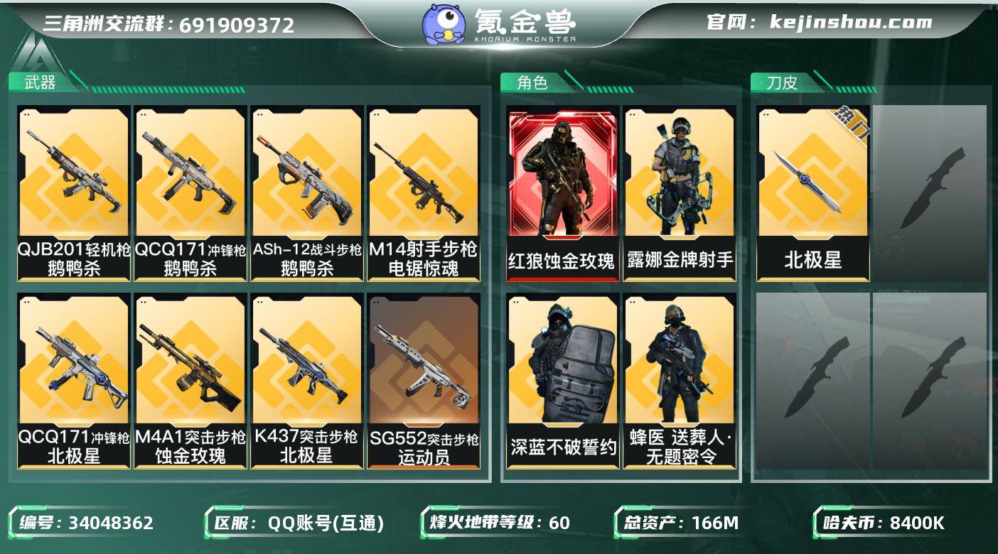 【LX86932 追封包赔+包人脸】【总资产:166m,流动资产:138.2m-1干员红皮:红狼 蚀金玫瑰-刀皮:北极星】 挂饰:统统拿走(隐藏款)-60烽火等级-黑鹰-25战场等级-列兵 【干员外观】:红狼-蚀金玫瑰,蜂医-送葬人·无题密令,深蓝-不破誓约,露娜-金牌射手 【近战皮肤】:近战-北极星,近战-黑鹰 【传说外观】:M4A1突击步枪-蚀金玫瑰,M4A1突击步枪-阿米娅,ASh-12战斗步枪-鹅鸭杀,SG552突击步枪-运动员,AK-12突击步枪-特斯拉线圈,SCAR-H战斗步枪-启航,G3战斗步枪-骑士,CAR-15突击步枪-阿米娅,腾龙突击步枪-捞点薯条,K437突击步枪-北极星,KC17突击步枪-电锯惊魂,UZI冲锋枪-特斯拉线圈,SR-3M紧凑突击步枪-特斯拉线圈,勇士冲锋枪-能天使-午夜邮差,QCQ171冲锋枪-北极星,QCQ171冲锋枪-鹅鸭杀,725双管霰弹枪-送葬人-无题密令,M250通用机枪-骑士之心,QJB201轻机枪-鹅鸭杀,M14射手步枪-电锯惊魂,AWM狙击步枪-捞点薯条,93R-捞点薯条,复合弓-黑·天际线 【史诗外观】:AKM突击步枪-林中猎手,ASh-12战斗步枪-无极限,AUG突击步枪-蝮蛇,M7战斗步枪-百步穿杨,SG552突击步枪-深海恐惧,SCAR-H战斗步枪-囚徒,G3战斗步枪-流沙送葬,AS Val突击步枪-典狱官,AS Va...