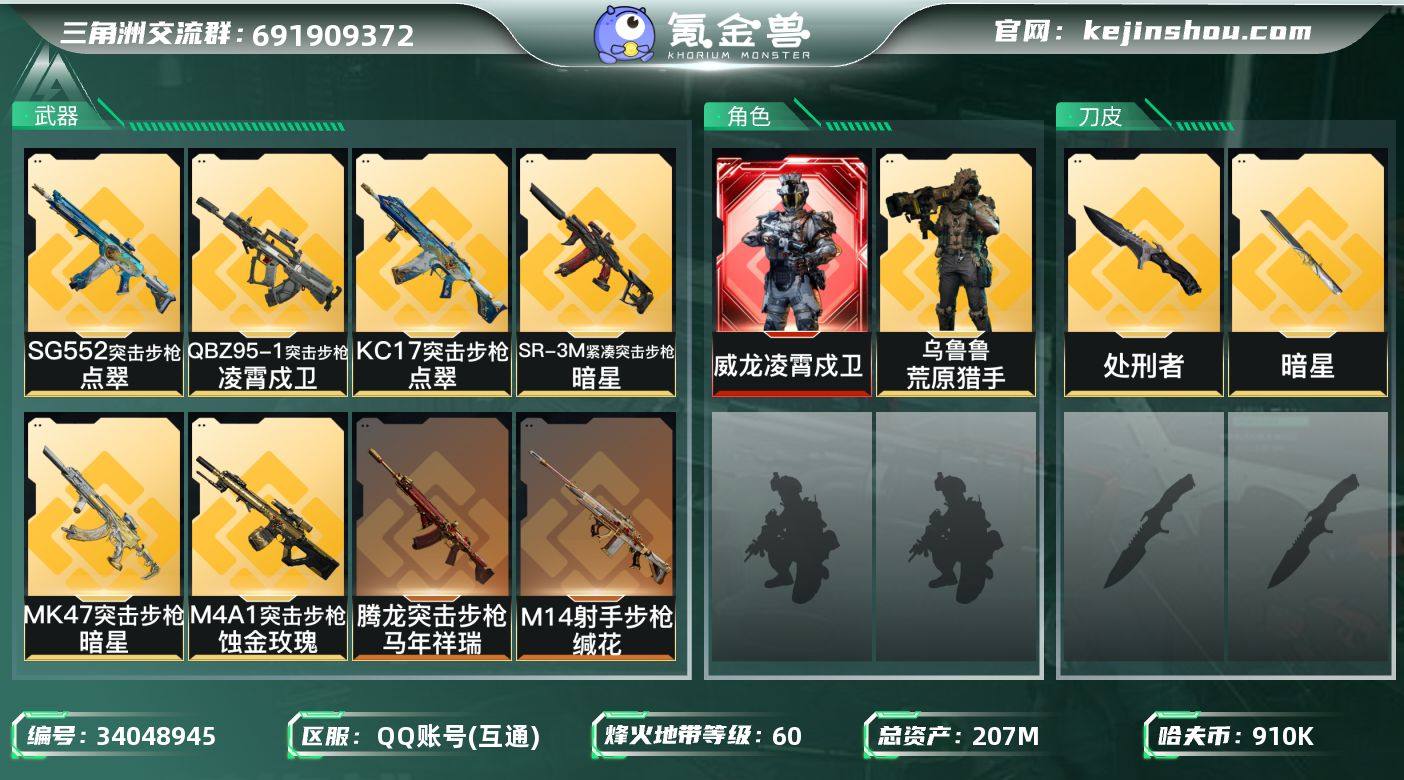 【高资产207M+2刀 1红皮部门全4精品号】QQD287/包人脸/QQ区【总资产:207M+近战暗星+近战处刑者+威龙凌霄戍卫】/烽火等级:60/全面战场:35/纯币:910192/三角券加币:89(9三角币+80三角券)【近战-暗星】【近战-处刑者】【威龙-凌霄戍卫】【乌鲁鲁-荒原猎手】//部门:44444/特勤等级(技术中心3级/工作台3级/制药台3级/防具台3级/仓库10级/指挥中心6级/训练中心7级/靶场7级/潜水中心2级/收藏室2级)---暗星捆绑包---/橙色挂饰x8/流动资产:88M段位:钻石III/详细看图/15发AWM子弹,