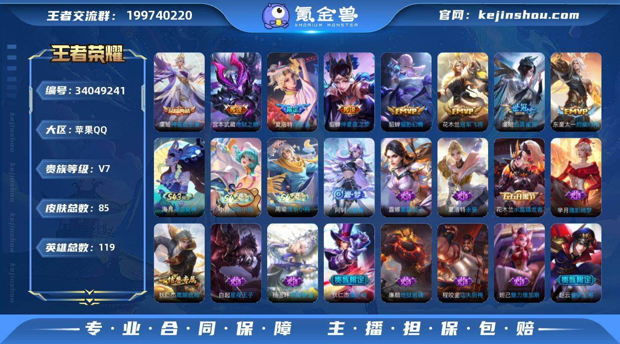 实名: 可修改 性别: 女号 贵族等级: V7 英雄数: 119 皮肤数: 85 荣耀水晶: 神鉴启示录 传说皮: 冠军飞将,猫影幻舞,云霓雀翎,仲夏夜之梦,地狱之眼,浮生妄,灼幽烈阳 亮点: 【优质装备】:神鉴启示录,冠军飞将,猫影幻舞,云霓雀翎,仲夏夜之梦(大飞蛾),地狱之眼,浮生妄,灼幽烈阳