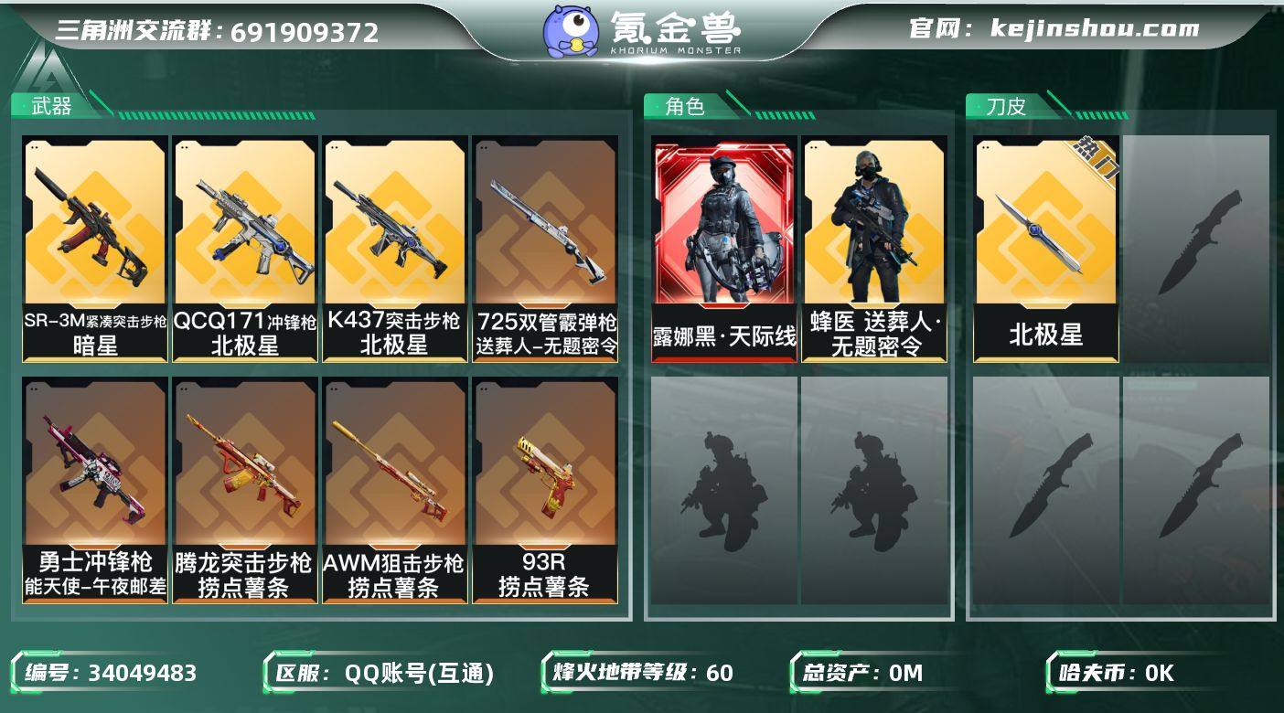 实名: 不可修改 烽火地带段位: 黑鹰 全面战场段位: 无段位 总资产: 118 哈夫币: 3 干员外观: 蜂医-送葬人·无题密令(S5),露娜-黑·天际线 传说武器皮肤: 近战-北极星,K437突击步枪-北极星,QCQ171冲锋枪-北极星,725双管霰弹枪-送葬人-无题密令,M4A1突击步枪-阿米娅,CAR-15突击步枪-阿米娅,复合弓-黑-天际线,AWM狙击步枪-捞点薯条,腾龙突击步枪-捞点薯条,93R-捞点薯条,SR-3M紧凑突击步枪-特斯拉线圈,UZI冲锋枪-特斯拉线圈,勇士冲锋枪-能天使-午夜邮差,SR-3M紧凑突击步枪-暗星 亮点: 【优质装备】:近战-北极星