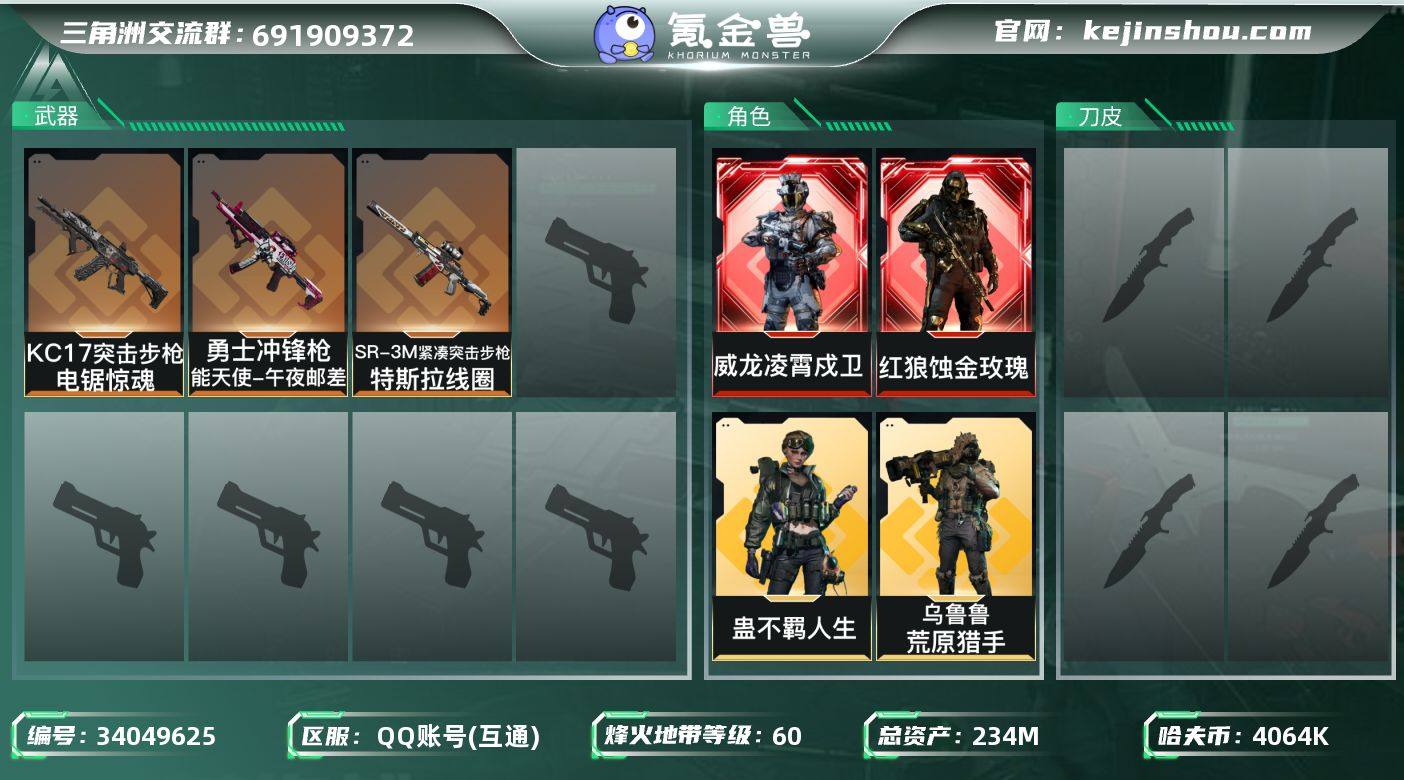 A12967/包人脸/QQ区/【0封禁】【总资产:234M+55发AWM+近战信条+红狼蚀金玫瑰+威龙凌霄戍卫+非洲之心+部门全3+仓库9+满体+负重6+守信不渝】/烽火等级:60级/全面战场:19级/纯币:4064K/三角券加币:395(三角币55+三角券340)【近战-信条】【红狼-蚀金玫瑰/威龙-凌霄戍卫】红狼-电锯惊魂/露娜-金牌射手/蛊-不羁人生/乌鲁鲁-荒原猎手/蜂医-送葬人无题密令/部门:33333/特勤等级(技术中心3级/工作台3级/制药台3级/防具台3级/仓库9级/指挥中心6级/训练中心7级/靶场6级/潜水中心1级/收藏室1级)M4A1突击步枪-蚀金玫瑰/QBZ95-凌霄戍卫/勇士冲锋枪-能天使午夜邮差/KC17突击步枪-电锯惊魂/SR-3M紧凑突击步枪-特斯拉线圈/橙色挂饰x6/段位:钻石(流动资产:188.8M)/详细看图
