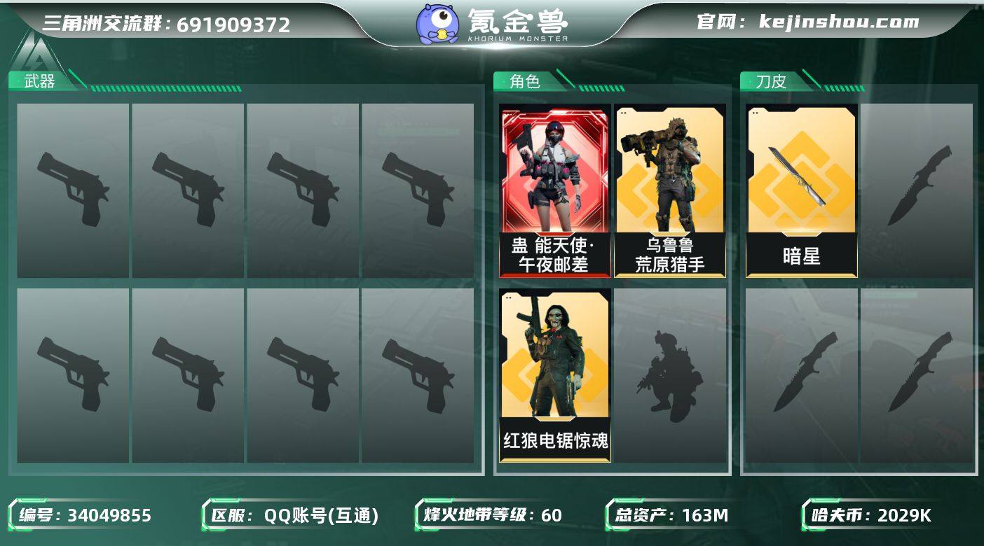 163.5M暗星 个人信息:战场等级:50 军衔:校官2 行动等级:60 烽火段位:铂金4哈夫币:20295k总资产:163.5M货币:0三角币 0曼德尔币 1526三角券安全箱:基础安全箱通行证:1特勤处:技术中心Lv.3 工作台Lv.3 制药台Lv.3 防具台Lv.3 仓库Lv.9 指挥中心Lv.5 训练中心Lv.7 靶场Lv.6 潜水中心Lv.2 收藏室Lv. 2角色皮肤:蛊-午夜邮差 红狼-电锯惊魂 乌鲁鲁-荒野猎手 近战皮肤:暗星 黑鹰 ,近战-暗星,近战-黑鹰,蛊-能天使午夜邮差,红狼-电锯惊魂,乌鲁鲁-荒原猎手