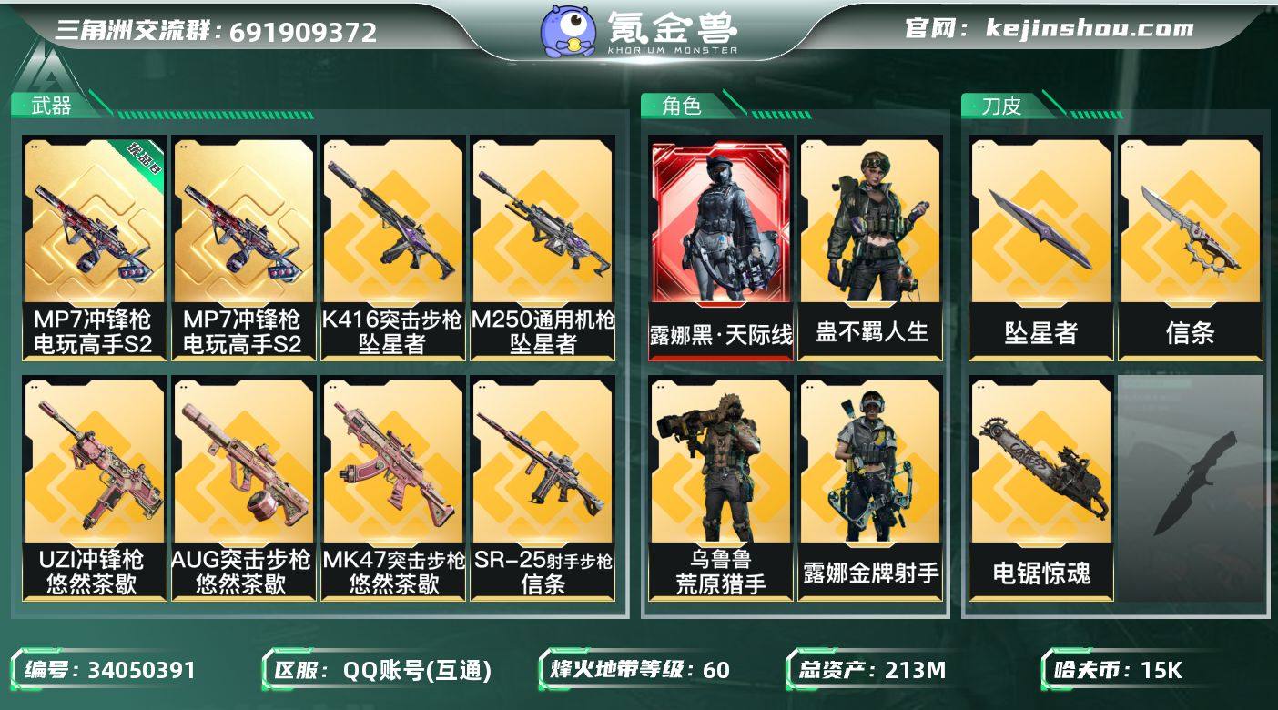 【PTSJZ5170】总资产213M/哈夫币1万/传说近战数1/传说枪皮数45/战场等级50/行动等级60/安全箱等时效性道具以游戏内数据为准,详情请看图/露娜-黑·天际线/蜂医-送葬人·无题密令(S5)/无名-夜鹰(S4)/深蓝-不破誓约(S6)/红狼-电锯惊魂/露娜-金牌射手(S7)/乌鲁鲁-荒原猎手/蛊-不羁人生/近战-坠星者/近战-信条/近战-电锯惊魂/近战-处刑者4级/近战-黑鹰/MP7冲锋枪-电玩高手S2/优品B典藏武器外观-MP7冲锋枪-电玩高手S2/M4A1突击步枪-阿米娅/AKM突击步枪-锦绣/ASh-12战斗步枪-鹅鸭杀/K416突击步枪-行动记录/K416突击步枪-坠星者/AUG突击步枪-悠然茶歇/AUG突击步枪-西装暴徒/SG552突击步枪-运动员/AK-12突击步枪-夜鹰/AK-12突击步枪-特斯拉线圈/SCAR-H战斗步枪-启航/SCAR-H战斗步枪-荼蘼/G3战斗步枪-骑士/CAR-15突击步枪-黑鹰坠落/CAR-15突击步枪-阿米娅/腾龙突击步枪-捞点薯条/腾龙突击步枪-马年祥瑞/KC17突击步枪-电锯惊魂/MK47突击步枪-悠然茶歇/P90冲锋枪-信条/UZI冲锋枪-特斯拉线圈/UZI冲锋枪-悠然茶歇/SMG45冲锋枪-骑士/SR-3M紧凑突击步枪-特斯拉线圈/SR-3M紧凑突击步枪-荼蘼/勇士冲锋枪-能天使-午夜邮差/QCQ171冲锋枪-鹅鸭杀/QCQ171冲锋枪-不羁人生/S12K霰弹枪-电锯惊魂/725双管...