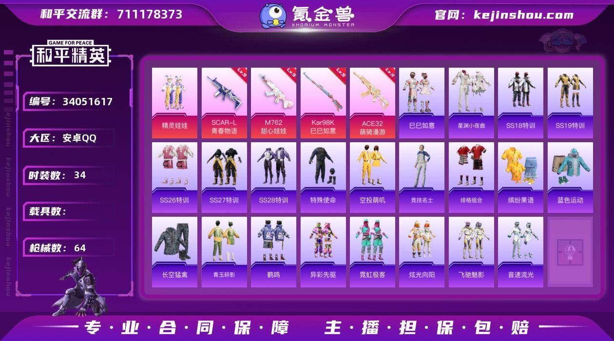 无二次-安卓 手Q-1粉装-4特效枪-0载具-0粉色飞行器-17730热力值-3王牌印记-34套装-64枪皮 【粉色套装】:粉装-精灵娃娃 【粉色枪皮等级】:SCAR-L-青春物语(五级),M762-甜心娃娃(五级),ACE32-萌骑漫游(三级),Kar98K-巳巳如意(五级) 【粉色枪皮】:SCAR-L-青春物语,M762-甜心娃娃,ACE32-萌骑漫游,Kar98K-巳巳如意 【粉色降落伞】:甜心娃娃降落伞,暗星紫秘降落伞,莲影清波降落伞,精灵梦叶罗丽降落伞 【稀有套装】:套装-巳巳如意,套装-星渊小夜曲 【稀有枪皮】:AKM-夜灯,AKM-彩虹符号,M16A4-幻世战舞者,SCAR-L-炫彩节奏,M416-夜灯,GROZA-异彩先驱,AUG-天降萌叽,AUG-流星咚咚,QBZ-彩虹符号,QBZ-飞驰魅影,AC-VAL-天降萌叽,蜜獾-天降萌叽,UZI-啾咪啾咪,UMP45-生命誓言,汤姆逊-异彩先驱,汤姆逊-像素花束,MP5K-异彩先驱,AKS-74U-鬼刀,P90-飞驰魅影,P90-巳巳如意,Kar98K-炫彩节奏,Kar98K-飞驰魅影,SKS-炫彩节奏,SKS-糯团青竹,Mini14-异彩先驱,Mini14-甜心娃娃,Mini14-耀粉歌者,S686-巳巳如意,S1897-飞驰魅影,S12K-玩趣呆呆,M249-彩虹符号,MG3-幻世战舞者,MG3-甜心娃娃,短管霰弹-竹节火铳,破片手榴弹-巳巳如意 【其他套装】:套装-SS18...