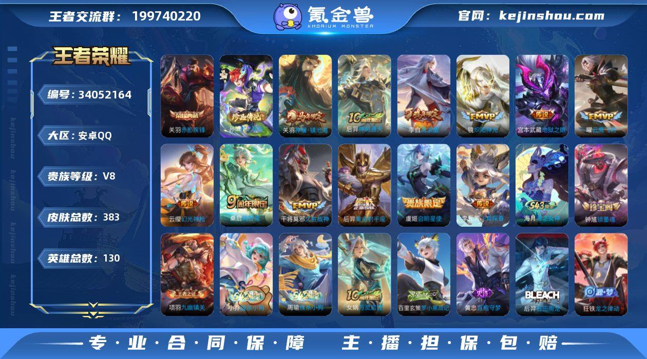 【精品男号383皮·130英雄-383皮肤-1典藏皮肤-1典藏英雄-1珍品传说-12传说-111史诗·赤影疾锋·时之奇旅·炽阳神光·凤求凰·至尊宝+9按键】 安卓Q-V8-至尊星耀IV段位-130英雄-383皮肤-1典藏皮肤-1典藏英雄-1珍品传说-12传说-111史诗 【英雄全皮】:刘邦全皮,孙权全皮,鬼谷子全皮,空空儿全皮,影全皮 【荣耀典藏】:武则天英雄,关羽赤影疾锋 【珍品传说】:孙策时之奇旅 【传说皮肤】:关羽神骥镇沧海,后羿神树通天,云缨幻光神枪,桑启鸣野蒿,李元芳飞鸢探春,镜炽阳神光,虞姬启明星使,曜云鹰飞将,干将莫邪久胜战神,后羿黄金射手座,李白凤求凰,宫本武藏地狱之眼 【限定皮肤】:姜子牙天穹之誓,狄仁杰阴阳师,赵云皇家上将,墨子神迹守卫,嬴政白昼王子,孙尚香蔷薇恋人,鲁班七号狮舞东方,庄周高山流水,阿轲迷踪丽影,扁鹊奇幻香踪,白起夜都怪侠,芈月重明,芈月幻夜卜梦,吕布猎兽之王,周瑜赤莲之焰,元歌云间偶戏,元歌无心,夏侯惇朔风刀,甄姬游园惊梦,甄姬落雪兰心,曹操烛龙,典韦穷奇,典韦蓝屏警告,马可波罗暗影游猎,狄仁杰魔术师,狄仁杰万华元夜,达摩星际陆战队,达摩沙漠行僧,项羽海滩派对,老夫子醍醐杖,老夫子航海奇遇记,关羽冰锋战神,关羽...
