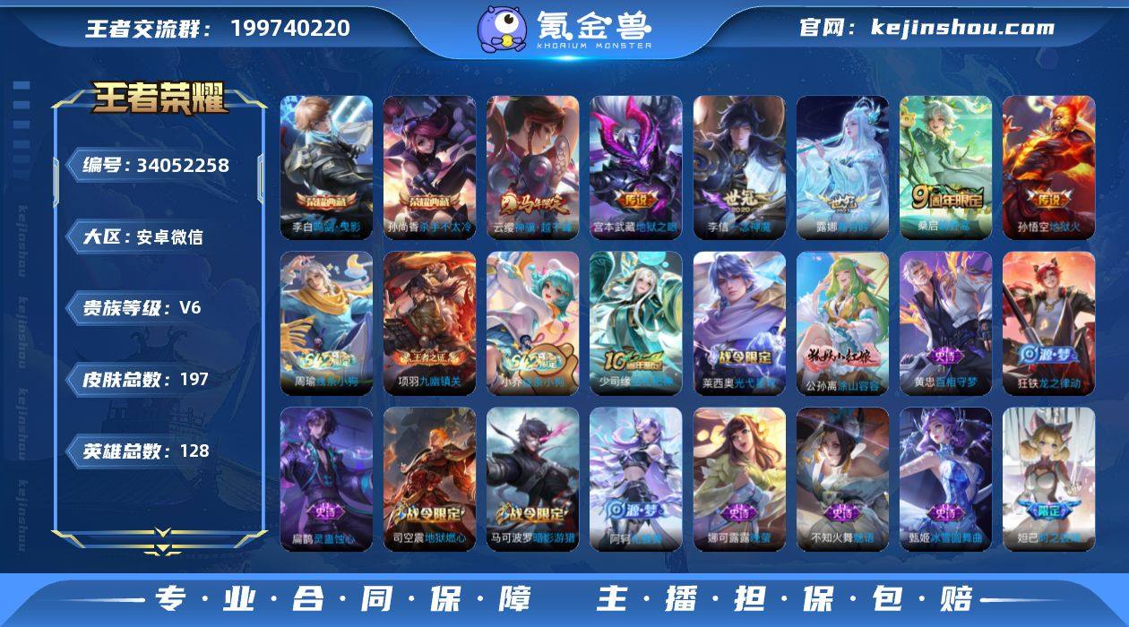 AL706757 【肝了多年心血号,寻有缘人接手】 皮肤数197 传说皮肤数6 史诗皮肤数65 英雄数128 营地id1729638009 贵族等级【文本】贵族6级 【贵族6级】 【是】 【是】 【启用】 【是】 【是】 【否】 【支持】 【安卓】 【找回包赔】 【接受还价】 【商家商品编号】 荣耀典藏2 内测皮肤2 限定皮肤54 赛季限定19 史诗皮肤66 战令限定16 勇者皮肤90 其他皮肤32 荣耀典藏:孙尚香杀手不太冷,李白鸣剑曳影; 内测皮肤:弈星万物之道,孙尚香蔷薇恋人; 限定皮肤:孙悟空神迹守卫,狄仁杰魔术师,妲己时之彼端,云缨神骥越千峰,扁鹊灵蛊蚀心,赵云皇家上将,百里玄策原初追逐者,少司缘巫礼祀神,弈星万物之道,上官婉儿梁祝,公孙离涂山容容,鬼谷子克喵,白起死霸装,钟馗虚灵犬护,狂铁龙之律动,阿古朵布丁狗之约,孙膑茶境仙,马超访茗客,阿轲化蝶舞,太乙真人谧流熔炉,牛魔星界战将,裴擒虎李小龙,桑启鸣野蒿,东皇太一噬灭天穹,盘古敬我三分,雅典娜黎明之约,虞姬夏日便利店,蔡文姬夏日便利店,蒙犽顽岩魄,孙尚香蔷薇恋人,姜子牙天穹之誓,镜青焰无极,项羽海滩派对,项羽苍威无极,刘邦剑破天穹,蒙恬荣光圣徽,沈梦溪龙舞盛年,狄仁杰鹰眼统帅,嫦娥漠中幻影,鬼...