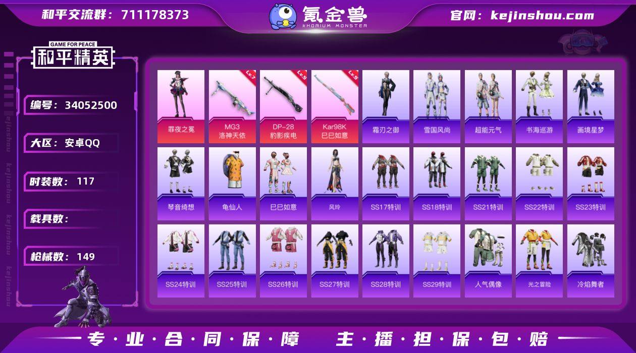 【LHPX824】【特价出售/店主推荐】安卓 手Q-1粉装-3特效枪-0载具-1粉色飞行器-41855热力值-12王牌印记-117套装-149枪皮【热门品类】:套装-龟仙人【粉色套装】:角色-罪夜之冕【粉色枪皮等级】:Kar98K-巳巳如意(五级),DP-28-豹影疾电(五级),MG3-洛神天依(七级)【粉色枪皮】:Kar98K-巳巳如意,DP-28-豹影疾电,MG3-洛神天依