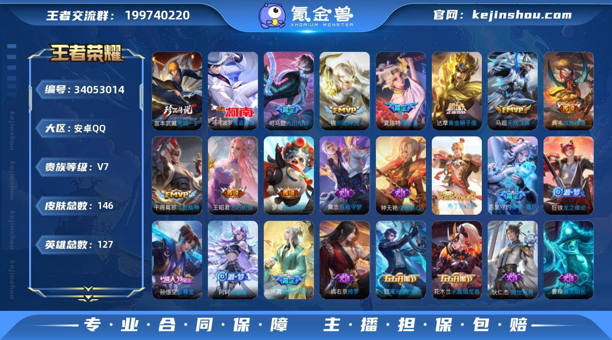 ·黑崎一护·天机无算天幕·浮生妄·愿照山河定·神骥逐星野·愿照千秋盛·九山相柳·乞巧织情·无双飞将·炽阳神光·踏浪归·至尊宝·无二次包过】w27267-安卓Q-127英雄-146皮肤-7王者印记-160铭文-贵族积分3w【贵族7】【2珍品·16传说·1天幕·19按键·211幸运值】【因赛季更新游戏段付以上号为准!】 【英雄全皮】:孙权全皮,敖隐全皮 【珍品传说】:宫本武藏黑崎一护,马可波罗怪盗基德 【天幕】:天机无算天幕 【传说皮肤】:韩信踏浪归,马超神骥逐星野,后羿神树通天,司马懿九山相柳,司空震愿照山河定,女娲愿照千秋盛,澜愿照九州拓,桑启鸣野蒿,典韦战鼓燎原,夏洛特浮生妄,马超无双飞将,王昭君乞巧织情,镜炽阳神光,干将莫邪久胜战神,达摩黄金狮子座,梦奇胖达荣荣 【限定皮肤】:姜子牙天穹之誓,狄仁杰阴阳师,赵云皇家上将,狄仁杰魔术师,达摩沙漠行僧,项羽海滩派对,兰陵王金庭之子,孙悟空至尊宝,干将莫邪胡桃夹子,百里玄策原初追逐者,鲁班大师探海日志,夏洛特浮生妄,鬼谷子天穹祈灯,沈梦溪龙舞盛年,刘邦剑破天穹,关羽决胜骁骑,刘备异域游侠,芈月浮光幕影,周瑜熔金海岸 【年限皮肤】:司空震愿照山河定,女娲愿照千秋盛,澜愿照九州拓 【赛季限定】:达摩沙...
