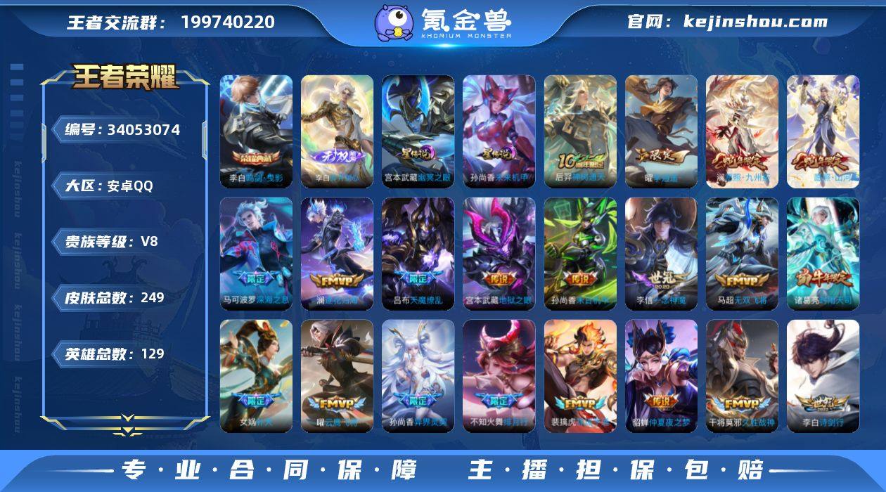 【精品推荐·鸣剑曳影·碎月剑心·愿照山河定·李逍遥·时雨天司·逐花归海·神器狴犴令·绯月行·深海之息·补天·孙尚香异界灵契·时雨天司·猫影幻舞·启示之音·可二次】YXw27294-安卓Q-129英雄-249皮肤-20王者印记-180铭文-贵族积分7w【贵族8】【1典藏·1无双·2星传说·24传说·1天幕·8按键】【因赛季更新游戏段付以上号为准!】 【英雄全皮】:孙权全皮,苍全皮,敖隐全皮,司空震全皮 【荣耀典藏】:李白鸣剑曳影 【无双皮肤】:李白碎月剑心 【星元皮肤】:孙尚香未来机甲,宫本武藏幽冥之眼 【天幕】:共赏芳华天幕 【传说皮肤】:后羿神树通天,司空震愿照山河定,澜愿照九州拓,裴擒虎祥瑞亨通,澜逐花归海,李白诗剑行,狄仁杰神器狴犴令,不知火舞绯月行,马可波罗深海之息,马超无双飞将,露娜启示之音,女娲补天,孙尚香异界灵契,曜李逍遥 ,诸葛亮时雨天司,虞姬启明星使,曜云鹰飞将,李信一念神魔,貂蝉猫影幻舞,干将莫邪久胜战神,貂蝉仲夏夜之梦,孙尚香末日机甲,宫本武藏地狱之眼,吕布天魔缭乱 【限定皮肤】:姜子牙天穹之誓,狄仁杰阴阳师,赵云皇家上将,赵云龙胆,孙尚香蔷薇恋人,孙尚香异界灵契,庄周高山流水,芈月幻夜卜梦,吕布天魔缭乱,元歌无心,马可波罗深...