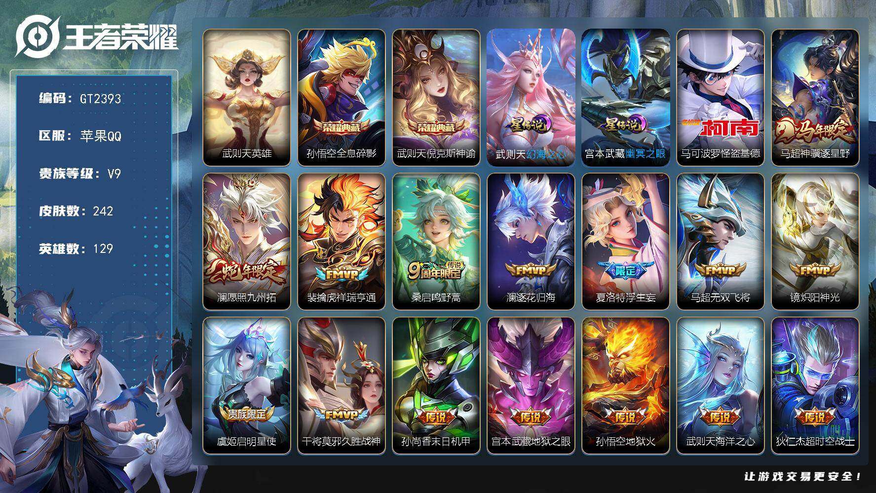 2579725-可换绑【高质量精品v9·打野45段·金标万战老虎+梅西·金标镜·怪盗基德·3典藏含武则天·蛇限澜·浮生妄·蓝屏警告·冰封战神·贵族积分14w】 2星传说 4按键 10王者印记 200五级铭文 无二次苹果Q-V9-242皮肤-2典藏皮肤-1典藏英雄-1珍品传说-15传说-68史诗【荣耀典藏】:武则天英雄,孙悟空全息碎影,武则天倪克斯神谕【珍品传说】:马可波罗怪盗基德【星元皮肤】:武则天幻海之心,宫本武藏幽冥之眼【传说皮肤】:马超神骥逐星野,澜愿照九州拓,裴擒虎祥瑞亨通,桑启鸣野蒿,澜逐花归海,夏洛特浮生妄,马超无双飞将,镜炽阳神光,虞姬启明星使,干将莫邪久胜战神,孙尚香末日机甲,宫本武藏地狱之眼,孙悟空地狱火,武则天海洋之心,狄仁杰超时空战士【限定皮肤】:白起狰,姜子牙天穹之誓,狄仁杰阴阳师,赵云皇家上将,嬴政白昼王子,芈月重明,吕布猎兽之王,元歌无心,夏侯惇朔风刀,典韦穷奇,典韦蓝屏警告,马可波罗暗影游猎,马可波罗山海玄木吟,狄仁杰魔术师,狄仁杰万华元夜,项羽海滩派对,老夫子醍醐杖,关羽冰锋战神,程咬金演武夺筹,韩信逐梦之影,牛魔御旌,虞姬启明星使,钟馗驱傩正仪,杨玉环遇见飞天,女娲朔望之晖,东皇太一逐梦之光,鬼谷子原初探秘者...