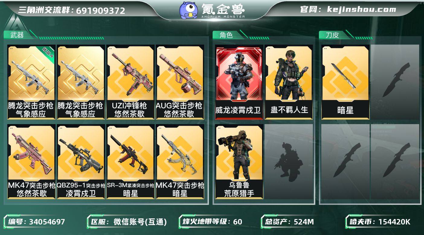 W16511 可立即换绑无需挂单养号 524m总资产-154420k哈夫币-60烽火等级-铂金-26战场等级-上等兵 【干员外观】:威龙-凌霄戍卫,乌鲁鲁-荒原猎手,蛊-不羁人生 【近战皮肤】:近战-暗星,近战-处刑者4级,近战-黑鹰 【典藏外观】:腾龙突击步枪-气象感应 【典藏外观成色】:腾龙突击步枪-气象感应(优品A) 【传说外观】:QBZ95-1突击步枪-凌霄戍卫,AUG突击步枪-悠然茶歇,SCAR-H战斗步枪-水墨云图,MK47突击步枪-悠然茶歇,MK47突击步枪-暗星,UZI冲锋枪-悠然茶歇,SR-3M紧凑突击步枪-暗星,QCQ171冲锋枪-不羁人生,M14射手步枪-蛮荒,SKS射手步枪-骑士 【史诗外观】:K416突击步枪-冬日风情,K416突击步枪-腊梅,SG552突击步枪-深海恐惧,K437突击步枪-丛影谍踪,SMG-45冲锋枪-阿萨拉特攻,SR-3M紧凑突击步枪-开工大吉,勇士冲锋枪-丛影谍踪,MP7冲锋枪-六套之力,PKM通用机枪-阿萨拉特攻,M249轻机枪-丛影谍踪,M250通用机枪-囚徒,QJB201轻机枪-炽焰,VSS射手步枪-丛影谍踪, M14射手步枪-航天庆典,M700狙击步枪-哈夫克警备 【稀有外观】:M870霰弹枪-地平线,SG552突击步枪-巨兽,AKM突击步枪-肃杀,K416突击步枪-精英联盟,SG552突击步枪-马年新春,SG552突击步枪-贴花...