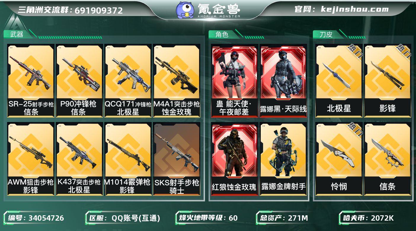 【多热门皮肤号-S8顶级安全箱:三红皮+四刀皮,满特勤,高额资产271M,蚀金玫瑰+黑天际线+能天使午夜邮差】【北极星+信条+怜悯+影锋】【Q区三端互通】【无二次】YXz8341-特勤处:仓库10级/靶场7级/训练中心7级-总资产271.1m-哈夫币207w-烽火等级:60级 【干员外观】:红狼-蚀金玫瑰,露娜-黑·天际线,蛊-能天使午夜邮差,威龙-壮志凌云,蜂医-送葬人·无题密令,无名-夜鹰,深蓝-不破誓约,红狼-电锯惊魂,露娜-金牌射手 【近战皮肤】:近战-北极星,近战-信条,近战-影锋,近战-怜悯,近战-黑鹰 【传说外观】:M4A1突击步枪-蚀金玫瑰,M4A1突击步枪-阿米娅,SG552突击步枪-运动员,AK-12突击步枪-夜鹰,AK-12突击步枪-特斯拉线圈,SCAR-H战斗步枪-铁艺苍穹,SCAR-H战斗步枪-启航,CAR-15突击步枪-阿米娅,腾龙突击步枪-捞点薯条,K437突击步枪-北极星,KC17突击步枪-电锯惊魂,P90冲锋枪-信条,Vector冲锋枪-能天使-午夜邮差,UZI冲锋枪-特斯拉线圈,SMG-45冲锋枪-骑士,SR-3M紧凑突击步枪-特斯拉线圈,勇士冲锋枪-能天使-午夜邮差,QCQ171冲锋枪-北极星,M1014霰弹枪-影锋,725双管霰弹枪-送葬人-无题密令,M250通用机枪-骑士之心,M14射手步枪-蛮荒,SKS射手步枪-骑士,SR-2...