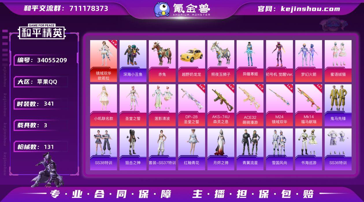 热力值:48807,收藏分:44044,1神装,7粉装,5粉枪,3载具,16粉色战备,95套装,130枪械,209装备,8滑翔尾翼,37降落伞,卓越收藏家:60级;等级:Lv.49 历史最高段位:超级王牌4星 当前段位:荣耀.皇冠Ⅳ;王牌印记3次;地铁满天赋; 【热门品类】:镜域双华-欧若拉[3级],套装-暗影哥特,套装-深海小丑鱼,套装-小丑鱼,角色-忠真马岱,角色-忠义严颜,角色-8号机,撬棍-龙胆亮银枪,大砍刀-青龙偃月刀;【红色套装】:镜域双华-欧若拉[3级];【粉色套装】:粉装-梦幻火箭,粉装-莲影清波,角色-圣堂之誓,角色-小叽联名款,粉装-蜜语绒猫,角色-初号机觉醒Ver.,角色-异瞳寒姬;【粉色枪械】:ACE32-萌骑漫游[3级],M24-镜域双华[3级],Mk14-福马献瑞[1级],AKS-74U-森灵之息[4级],DP-28-圣堂之誓[5级];【粉色载具】:赤兔,照夜玉狮子,越野奶龙龙;【粉色滑翔尾翼】:齐天大圣飞行器,绝色倾城飞行器,小叽联名款飞行器[2级],镜域双华-灵镜之阶;【粉色降落伞】:猪猪侠降落伞,春暖花开降落伞,镜域双华降落伞,龙