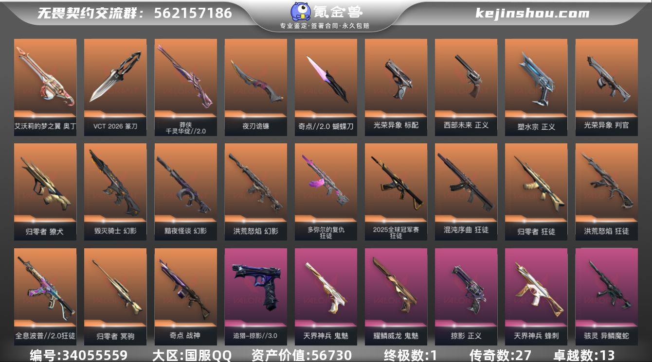 段位: 钻石 近战武器皮肤: 夜刃诡镰-黯夜怪谈,蝴蝶刀-奇点//2.0,VCT 2026 篆刀 步枪皮肤: 狂徒-紫阙金琅,狂徒-盖亚的复仇,獠犬-归零者,狂徒-归零者,戍卫-天界神兵,狂徒-盖世英雄,狂徒-耀鳞威龙,幻影-洪荒怒焰,狂徒-洪荒怒焰,狂徒-全息波普//2.0,狂徒-混沌序曲,幻影-黯夜怪谈,幻影-毁灭骑士,幻影-异鳞魔蛇,2025全球冠军赛 狂徒,多弥尔的复仇 狂徒 佩枪皮肤: 鬼魅-天界神兵,正义-塑水宗,鬼魅-耀鳞威龙,正义-掠影,正义-西部未来,标配-光荣异象,追猎-掠影//3.0 狙击枪皮肤: 冥驹-归零者,莽侠-千灵华绽//2.0 冲锋枪皮肤: 蜂刺-天界神兵,骇灵-异鳞魔蛇 霰弹枪皮肤: 雄鹿-起源,判官-光荣异象 机枪皮肤: 战神-奇点,奥丁-艾沃莉的梦之翼 亮点: 【充值总皮肤】: 天界神兵 鬼魅, 全息波普//2.0 狂徒, VCT 2026 篆刀, 掠影//3.0 追猎, 起源 雄鹿, 千灵华绽//2.0 莽侠, 奇点//2.0 蝴蝶刀, 塑水宗 正义, 多弥尔的复仇 狂徒, 毁灭骑士 幻影, 耀鳞威龙 狂徒, 2025全球冠军赛 狂徒, 盖亚的复仇 狂徒, 紫阙金琅 狂徒, 掠影 正义, 奇点 战神, 盖世英雄 狂徒, 归零者 狂徒, 天界神兵 蜂刺, 光荣异象 判官, 光荣异象 标配, 耀鳞威龙 鬼魅, 洪荒怒焰 狂徒, 混沌序曲 狂徒, 艾沃莉的梦之翼 奥丁, 黯夜...