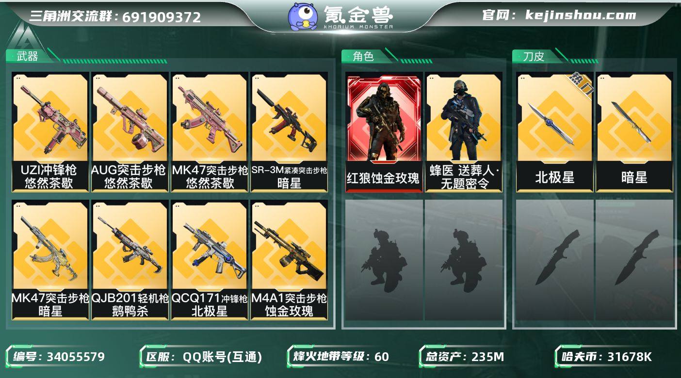 QQD269/包人脸/QQ区【总资产:234M+近战北极星+近战暗星+红狼蚀金玫瑰+非洲之心+62发AWM子弹+S8赛季通行证】/烽火等级:60/全面战场:4/纯币:31678K/三角券加币:150(10三角币+140三角券)【近战-北极星】【近战-暗星】【红狼-蚀金玫瑰】【蜂医-无题密令】【乌鲁鲁-荒原猎手】【深蓝-不破誓约】//部门:11211/特勤等级(技术中心2级/工作台3级/制药台3级/防具台3级/仓库7级/指挥中心3级/训练中心4级/靶场4级/潜水中心0级/收藏室1级)---北极星捆绑包/暗星捆绑包---/橙色挂饰x4/流动资产:217M段位:黑鹰IV/详细看图