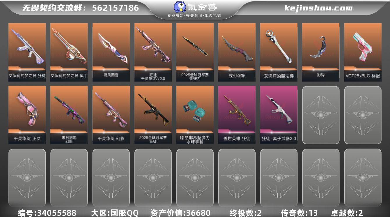 段位: 黄金 近战武器皮肤: 艾沃莉的魔法棒,夜刃诡镰-黯夜怪谈,影钩-掠影2.0,2025全球冠军赛 蝴蝶刀,流风回雪-千灵华绽//2.0,嘟昂嘟昂超弹力水球拳套-滋滋X特攻队 步枪皮肤: 狂徒-盖世英雄,幻影-千灵华绽,狂徒-艾沃莉的梦之翼,狂徒-离子武器2.0,幻影-末日泡泡,2025全球冠军赛 狂徒,狂徒-千灵华绽//2.0 佩枪皮肤: 正义-千灵华绽,标配-VCT25xBLG 机枪皮肤: 奥丁-艾沃莉的梦之翼 亮点: 【充值总皮肤】: 夜刃诡镰, 千灵华绽//2.0 狂徒, 流风回雪, 2025全球冠军赛 狂徒, 2025全球冠军赛 蝴蝶刀, 末日泡泡 幻影, 嘟昂嘟昂超弹力水球拳套, VCT25 x BLG 标配, 离子武器//2.0 狂徒, 影钩, 千灵华绽 幻影, 艾沃莉的梦之翼 狂徒, 盖世英雄 狂徒, 千灵华绽 正义, 艾沃莉的梦之翼 奥丁, 艾沃莉的魔法棒