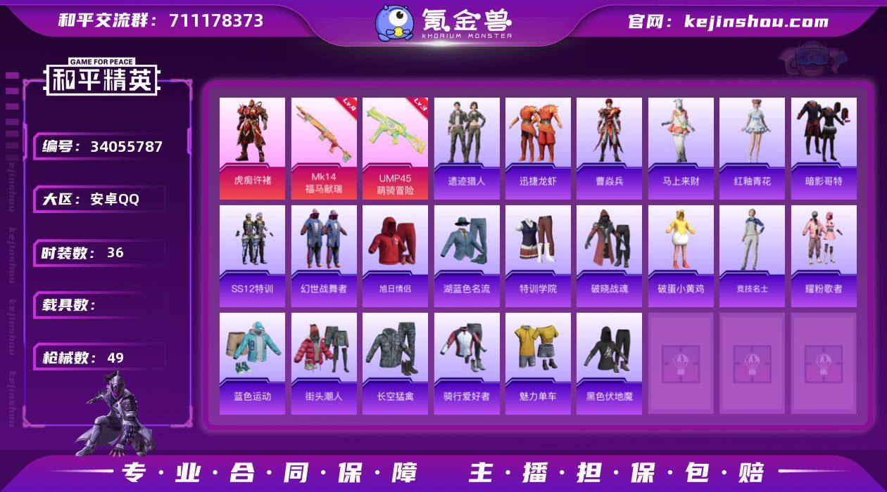 【FK6994】36套装/枪械2/装备49/战备31/王牌印记1/热力值11927/三级UMP45-萌骑冒险/四级MK14-福马献瑞/暗影哥特/虎痴许褚/UMP45-萌骑冒险/MK14-福马献瑞/炫彩糖果飞行器/炫彩糖果降落伞/炫彩糖果/马上来财/迅捷龙虾/遗迹猎人/雨过天青/红釉青花/曹焱兵/AUG-冰晶雪宝/AKM-破晓战魂/SCAR-L-炫彩节奏/SCAR-L-红色方程式/M416-蓝色火焰/蜜獾-虎痴许褚/UZI-影袭/UZI-炫彩节奏/汤姆逊-天降萌叽/汤姆逊-像素花束/SKS-炫彩节奏/SKS-糯团青竹/S686-红色方程式/S686-千金淑猫/S12K-夜灯/MG3-幻世战舞者/SS12特训/幻世战舞者/旭日情侣/湖蓝色名流/特训学院/破晓战魂/破蛋小黄鸡/竞技名士/耀粉歌者/蓝色运动/街头潮人/长空猛禽/骑行爱好者/魅力单车/黑色伏地魔