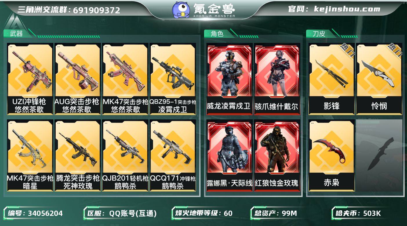 A12975/可二次/QQ区【总资产:107M+近战赤枭+近战怜悯+近战影锋+威龙凌霄戍卫+红狼蚀金玫瑰+骇爪水墨云图+露娜黑天际线+骇爪维什戴尔+20AW子弹】/烽火等级:60级/全面战场:50级/纯币:503K/三角券加币:2050(三角币1410+三角券640)【近战-赤枭/近战-怜悯/近战-影锋】【威龙-凌霄戍卫/红狼-蚀金玫瑰/骇爪-水墨云图/露娜-黑天际线/骇爪-维什戴尔】【露娜-金牌射手/红狼-电锯惊魂/威龙-壮志凌云/深蓝-不破誓约/乌鲁鲁-荒原猎手/无名-夜鹰/蜂医-无题密令/蛊-不羁人生】/部门:22322/特勤等级(技术中心3级/工作台3级/制药台3级/防具台3级/仓库8级/指挥中心5级/训练中心6级/靶场6级/潜水中心1级/收藏室0级)AKM突击步枪-锦绣/QBZ突击步枪-凌霄戍卫/MK47突击步枪-暗星/AWM狙击步枪-影锋/橙色挂饰x15/段位:钻石(流动资产:87.3M)/详细看图