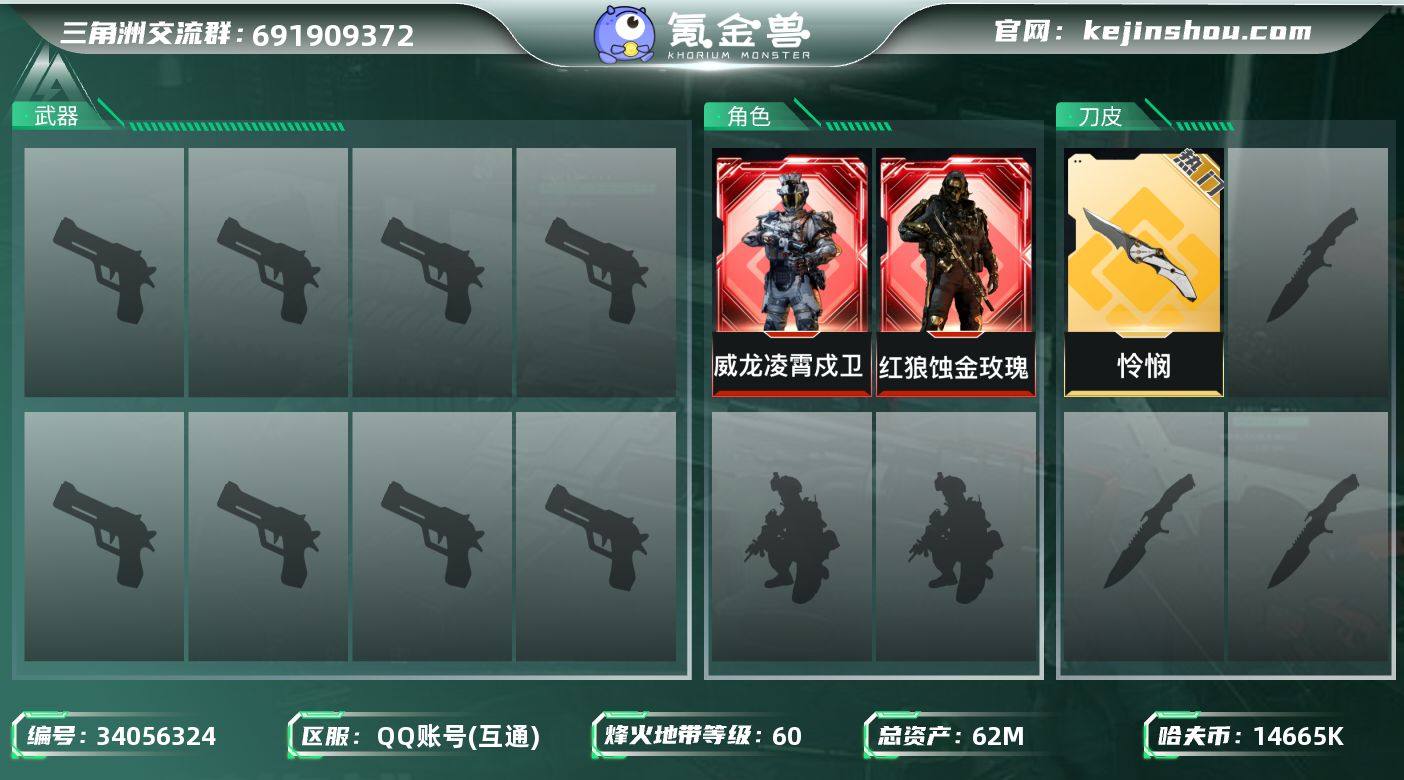 QFY317/可二次/QQ区/【精品2红皮1刀皮猛攻号】【总资产:62M+近战怜悯+威龙凌霄戍卫+红狼蚀金玫瑰+S9赛季2×3+3S挂饰黑夜猎手】/烽火等级:60级/全面战场:9级/纯币:14665K/三角券加币:531(20三角币+511三角券)【近战-怜悯】【威龙-凌霄戍卫+红狼-蚀金玫瑰】【无名-夜鹰+红狼-电锯惊魂+乌鲁鲁-荒原猎手+深蓝-不破誓约】//部门:33223/特勤等级(技术中心3级/工作台3级/制药台3级/防具台3级/仓库6级/指挥中心6级/训练中心7级/靶场6级/潜水中心1级/收藏室0级)---特斯拉线圈+荼蘼+万金泪冠+缄花捆绑包---/橙色挂饰x/流动资产:43M段位:黑鹰/详细看图,红狼-蚀金玫瑰,威龙-凌霄戍卫,近战-怜悯,特斯拉线圈捆绑包,荼蘼捆绑包
