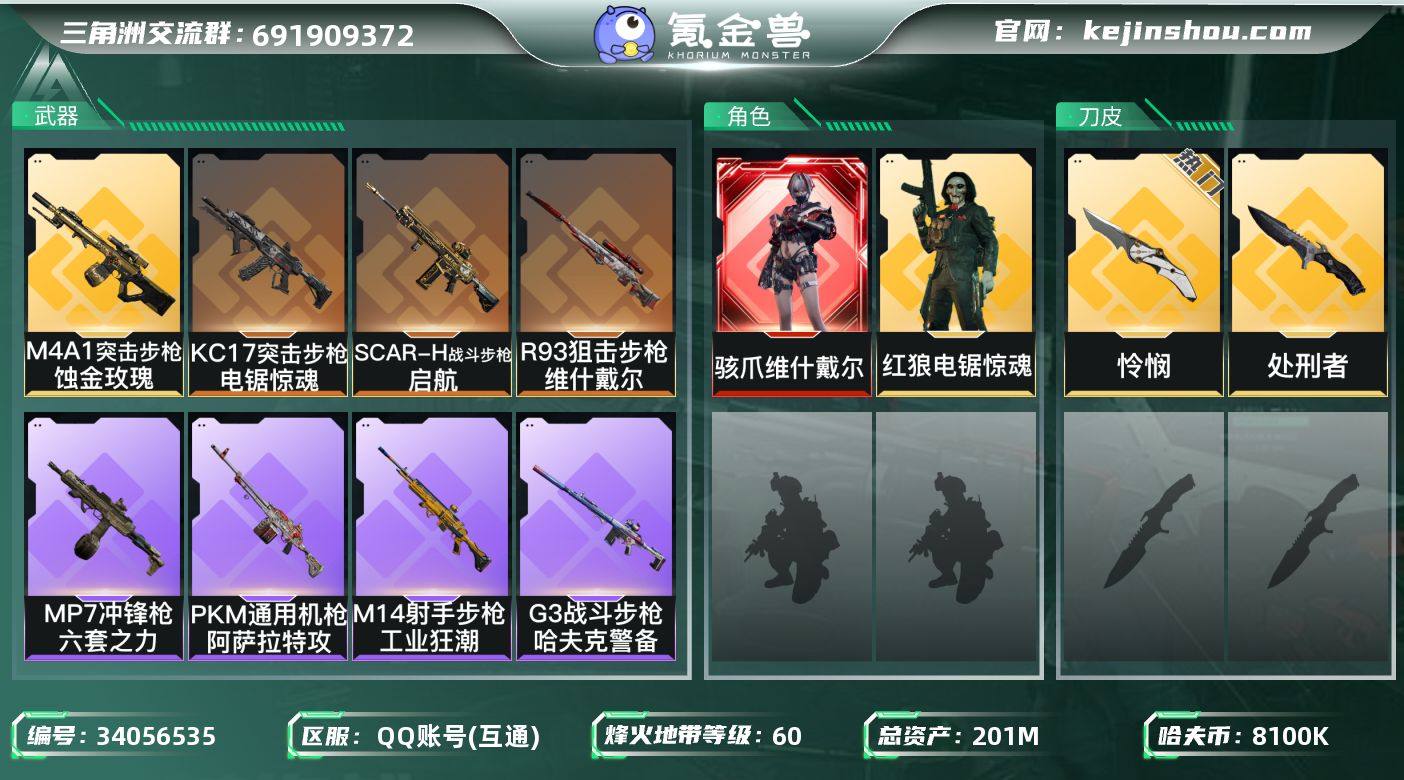 【PTSJZ4281】总资产201M/哈夫币810万/传说近战数1/传说枪皮数4/战场等级5/行动等级60/安全箱等时效性道具以游戏内数据为准,详情请看图/骇爪-维什戴尔/红狼-电锯惊魂/近战-怜悯/近战-处刑者/近战-黑鹰/M4A1突击步枪-蚀金玫瑰/SCAR-H战斗步枪-启航/KC17突击步枪-电锯惊魂/R93狙击步枪-维什戴尔/QBZ95-1突击步枪-曙光/AUG突击步枪-蝮蛇/G3战斗步枪-哈夫克警备/腾龙突击步枪-猎鳄行动/MP5冲锋枪-战术竞备/MP7冲锋枪-六套之力/S12K霰弹枪-曙光/PKM通用机枪-蝮蛇/PKM通用机枪-阿萨拉特攻/M250通用机枪-囚徒/QJB201轻机枪-炽焰/M14射手步枪-工业狂潮/SV98狙击步枪-猎鳄行动/K437突击步枪-巨兽/K416突击步枪-一帆风顺/M7战斗步枪-捣蛋鬼/SG552突击步枪-2026/SG552突击步枪-贴花艺术/腾龙突击步枪-冰天雪地/MP5冲锋枪-哈夫克卫队/P90冲锋枪-黄昏/P90冲锋枪-捣蛋鬼/Vector冲锋枪-先锋/UZI冲锋枪-亚特兰蒂斯/SMG-45冲锋枪-行动开启/SMG-45冲锋枪-幻影结构/勇士冲锋枪-冰天雪地/QCQ171冲锋枪-银鹭/M1014霰弹枪-幻影结构/M249轻机枪-冰天雪地/QJB201轻机枪-哈夫克卫队/Mini-14射手步枪-荣耀列队/G18-星链科技/G18-哈夫克航天/PTR-32突击步枪-噬菌体/M4A1突击步枪-粉色涂装/M4A1突击步枪-...
