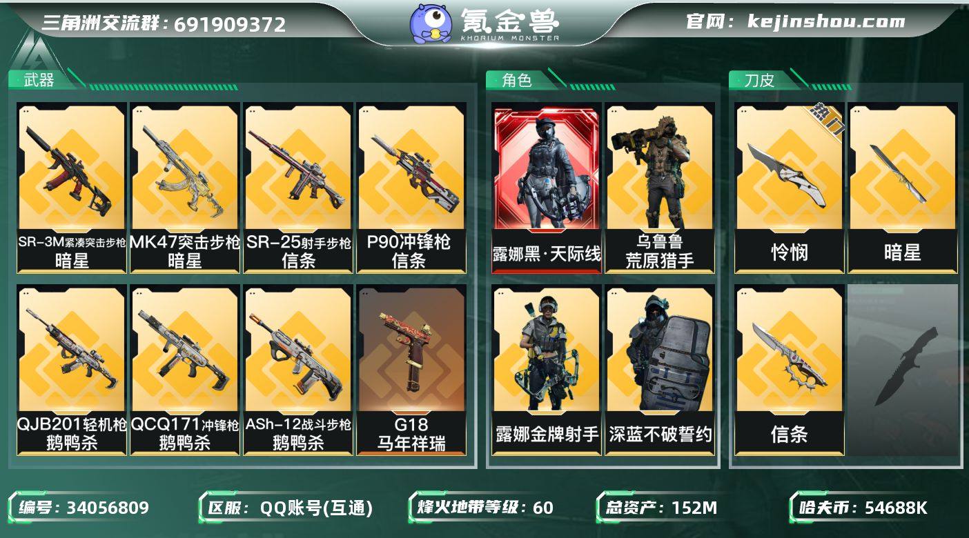 总资产:152.1M, 哈夫币:54688K ;总资产152M/哈夫币5468万/战场等级50/行动等级60/安全箱等时效性道具以游戏内数据为准,详情请看图 露娜-黑·天际线,蜂医-送葬人·无题密令,无名-夜鹰,深蓝-不破誓约,红狼-电锯惊魂,露娜-金牌射手,乌鲁鲁-荒原猎手,近战-暗星,近战-信条,近战-怜悯,近战-处刑者4级,近战-黑鹰,M4A1突击步枪-阿米娅,AKM突击步枪-锦绣,ASh-12战斗步枪-鹅鸭杀,K416突击步枪-行动记录,SG552突击步枪-运动员,AK-12突击步枪-夜鹰,AK-12突击步枪-特斯拉线圈,SCAR-H战斗步枪-启航,G3战斗步枪-骑士,CAR-15突击步枪-阿米娅,AS Val突击步枪-蛇年祥瑞,腾龙突击步枪-捞点薯条,腾龙突击步枪-马年祥瑞,腾龙突击步枪-万金泪冠,K437突击步枪-锦绣,KC17突击步枪-电锯惊魂,MK47突击步枪-暗星,P90冲锋枪-信条,UZI冲锋枪-特斯拉线圈,SMG-45冲锋枪-锦绣,SR-3M紧凑突击步枪-特斯拉线圈,SR-3M紧凑突击步枪-暗星,勇士冲锋枪-能天使-午夜邮差,勇士冲锋枪-万金泪冠,QCQ171冲锋枪-鹅鸭杀,725双管霰弹枪-送葬人-无题密令,M250通用机枪-骑士之心,QJB201轻机枪-鹅鸭杀,M14射手步枪-蛮荒,M14射手步枪-缄花,SKS射手步枪-骑士,SR-25射手步枪-水墨云图,SR-25射手步枪-信条,SR-25射手步枪-缄花,R93狙击...